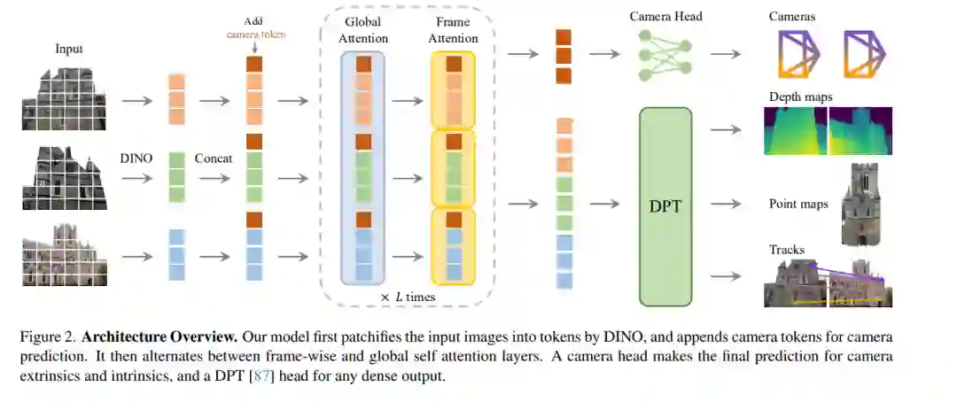 我们提出了VGGT,这是一种前馈神经网络,能够直接从场景的一个、几个甚至数百个视角中推断出所有关键的3D属性,包括相机参数、点云图、深度图和3D点轨迹。这一方法在3D计算机视觉领域迈出了重要一步,因为传统模型通常局限于单一任务并专门优化。VGGT不仅简单高效,能够在不到一秒的时间内重建图像,而且在性能上超越了需要后处理(如视觉几何优化技术)的替代方案。该网络在多个3D任务中实现了最先进的成果,包括相机参数估计、多视角深度估计、密集点云重建和3D点跟踪。我们还展示了使用预训练的VGGT作为特征骨干网络能够显著提升下游任务的性能,例如非刚性点跟踪和前馈式新视角合成。代码和模型已公开,可在以下链接获取:https://github.com/facebookresearch/vggt。