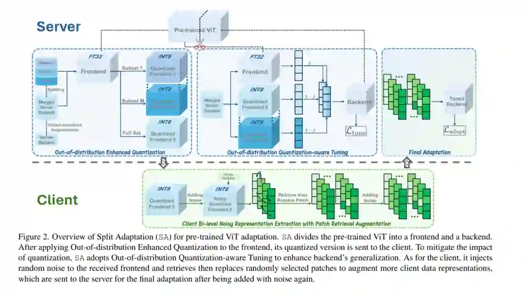 在大规模数据集上广泛预训练的视觉Transformer(ViTs)已成为基础模型的核心组成部分,使其能够在多种下游任务中以最小的适应成本实现卓越性能。因此,如何在不同领域(包括隐私敏感领域)中适应预训练的ViTs引起了越来越多的关注,尤其是在客户通常不愿共享数据的情况下。现有的适应方法通常需要直接访问数据,这使得它们在上述限制条件下难以实施。一个简单的解决方案可能是将预训练的ViT发送给客户进行本地适应,但这会引发模型知识产权保护问题,并给客户带来沉重的计算负担。为了解决这些问题,我们提出了一种新颖的分割自适应(SA)方法,该方法能够在保护数据和模型的同时实现有效的下游适应。SA受到分割学习(SL)的启发,将预训练的ViT分为前端和后端,仅将前端与客户共享以提取数据表示。但与常规SL不同,SA用低比特量化值替换前端参数,防止模型直接暴露。SA允许客户在前端和提取的数据表示中添加双层噪声,从而确保数据保护。相应地,SA结合了数据级和模型级的分布外增强,以减轻噪声注入对适应性能的影响。我们的SA专注于具有挑战性的少样本适应,并采用补丁检索增强来缓解过拟合问题。在多个数据集上的大量实验验证了SA相对于最先进方法的优越性,并展示了其在防止模型泄露的同时抵御高级数据重建攻击的能力,且客户端的计算成本极低。源代码可在以下链接获取:https://github.com/conditionWang/Split_Adaptation。 https://arxiv.org/pdf/2503.00441