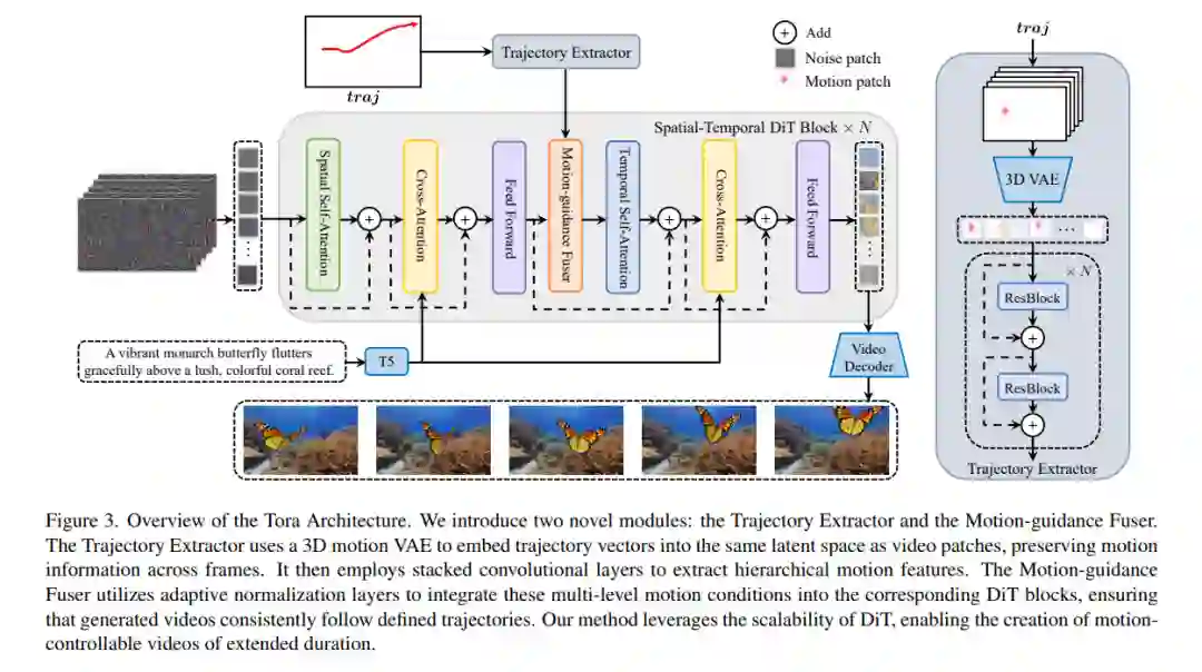 近年来,扩散Transformer(DiT)在生成高质量视频内容方面展现了卓越的能力。然而,基于Transformer的扩散模型在生成具有可控运动的视频方面的潜力仍未得到充分探索。本文提出了Tora,这是首个面向轨迹的DiT框架,能够同时整合文本、视觉和轨迹条件,从而实现具有有效运动指导的可扩展视频生成。具体而言,Tora由轨迹提取器(TE)、时空DiT和运动指导融合器(MGF)组成。TE通过3D运动压缩网络将任意轨迹编码为分层的时空运动补丁。MGF将这些运动补丁整合到DiT模块中,以生成准确遵循指定轨迹的一致性视频。我们的设计与DiT的可扩展性无缝结合,允许精确控制视频内容的动态特性,包括不同的时长、宽高比和分辨率。大量实验表明,与基础DiT模型相比,Tora在实现高运动保真度方面表现出色,同时能够准确模拟物理世界中的复杂运动。代码已在以下链接公开:https://github.com/alibaba/Tora。