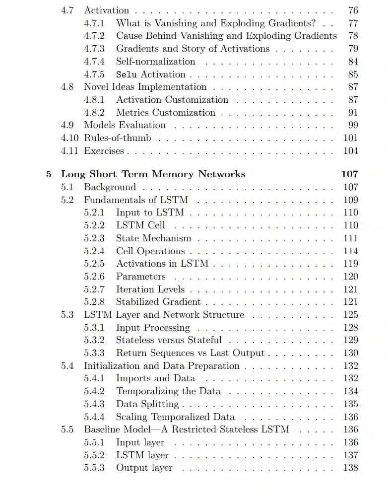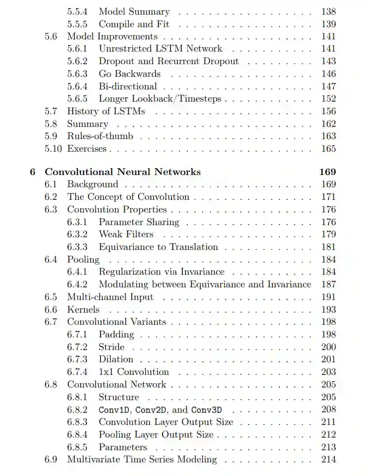 • 第4章在简单的回归模型和多层感知器之间找到了相似之处。它展示了如何通过非线性激活隐式地将一个复杂问题分解成小部分来区分它们。激活的基本梯度属性已经确定。此外,为了研究插图还实现了自定义激活。此外,增强MLP(以及大多数其他网络)的dropout概念也得到了解释,以及如何使用它? • LSTM机制是深度学习中最神秘的之一。第5章解构了一个LSTM单元,以可视化保存记忆的状态信息流。背后的秘密是梯度传输,这在其中得到了详细的解释。此外,TensorFlow中可用的LSTM的变体,如后向和双向,都得到了视觉上的解释。此外,LSTM有着丰富的历史和多种变体。它们被制成表格与TensorFlow中的变体进行比较。这提供了一个关于常用的LSTM与其他可能性的视角。 • 卷积网络使用卷积和池化操作。它们是简单的操作,但使卷积网络成为最有效的模型之一。第6章通过视觉示例和理论澄清解释了这两个概念。该章详细解释了卷积和池化的属性,如参数共享、过滤和不变性。此外,池化对总结卷积的需要在统计上得到了具体化。池化背后的统计也回答了像为什么最大池化通常优于其他池化,以及其他什么池化统计是可行的这样的问题? • 自编码器是用于无监督和半监督学习的结构。第7章通过与机器学习中的主成分分析相比较来解释它们。比较使得更容易理解它们的内部机制。自编码器学习特定任务的能力,如通过结合正则化进行去噪或特征学习进行分类,也得到了展示。此外,还开发了在编码上训练的分类器。 每一章都解释了概念,并用TensorFlow举例说明了模型的实现。实现步骤也详细解释,以帮助读者学习模型构建。 本书承认没有完美的模型。 因此,本书的目标是展示如何开发模型,使读者能够构建他自己的最佳模型。将深度学习视为烹饪的艺术。烹饪的一种方式是遵循食谱。但当我们了解食物、香料和火的行为时,我们做出了我们的创作。对“如何”这一问题的理解超越了创作本身。 同样地,对“如何”的理解也超越了深度学习。本书呈现了深度学习的构造、它们的基本原理以及它们的行为方式。基线模型也随之发展,并提供了改进它们的概念。 此外,深度学习建模选择的庞大性可能会令人不知所措。为避免这种情况,我们在结束章节之前有几个经验法则。它列出了建立和改进深度学习模型的基础知识。 总之,深度学习为解决复杂问题提供了一个强大的框架。它有几个结构。使用它们得到最佳模型有时很困难。本书的重点是理解这些结构,以有一个方向来开发有效的深度学习模型。到书的尾声,读者将理解每一个结构以及如何将它们组合在一起。