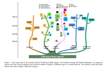 基于单个LLM智能体的启发性能力,已提出基于LLM的多智能体,以利用多个智能体的集体智能和专业化轮廓及技能。与使用单一LLM驱动的智能体的系统相比,多智能体系统通过1) 将LLMs专业化为具有不同能力的各种不同智能体,以及2) 使这些多样化的智能体之间进行互动,有效地模拟复杂的现实世界环境,提供了先进的能力。在这一背景下,多个自主智能体协作参与规划、讨论和决策,反映了人类团队工作在解决问题任务中的合作本质。这种方法利用了LLMs的沟通能力,借助它们生成文本进行交流和对文本输入的响应能力。此外,它利用了LLMs在各个领域的广泛知识和专门化特定任务的潜力。最近的研究已经展示了使用基于LLM的多智能体解决各种任务的有希望的结果,如软件开发[Hong等,2023; Qian等,2023]、多机器人系统[Mandi等,2023; Zhang等,2023c]、社会模拟[Park等,2023; Park等,2022]、政策模拟[Xiao等,2023; Hua等,2023]以及游戏模拟[Xu等,2023c; Wang等,2023c]。由于这个领域的跨学科研究性质,它吸引了来自社会科学、心理学和政策研究等不同背景的研究者,研究论文的数量正在迅速增加,如图1所示(受[Gao等,2023b]设计的启发),从而扩大了基于LLM的多智能体研究的影响。尽管如此,早期的工作是独立进行的,导致缺乏系统回顾以总结它们,建立这个领域的全面蓝图,并检查未来的研究挑战。这强调了我们工作的重要性,并作为呈现这篇综述论文的动机,致力于基于LLM的多智能体系统的研究。