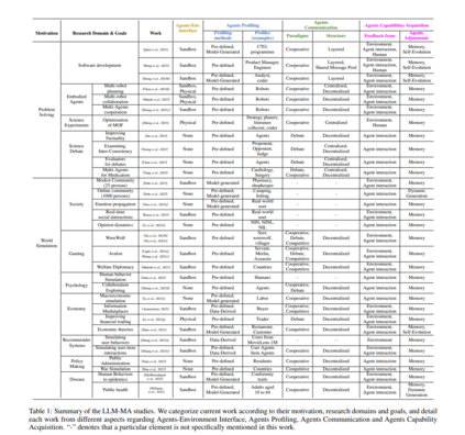 使用LLM-MA进行问题解决的主要动机是利用具有专门专业知识的智能体的集体能力。这些智能体,每个都作为个体行动,协作以有效地解决复杂问题,例如软件开发、具体化智能体、科学实验和科学辩论。 LLM-MA的另一个主流应用场景是世界模拟。这一领域的研究正在迅速增长,涵盖了包括社会科学、游戏、心理学、经济学、政策制定等在内的多种领域。在世界模拟中使用LLM-MA的关键原因在于它们出色的角色扮演能力,这对于现实地描绘模拟世界中的各种角色和观点至关重要。世界模拟项目的环境通常被设计来反映被模拟的特定场景,智能体以各种轮廓设计以匹配这一背景。与专注于智能体合作的问题解决系统不同,世界模拟系统涉及多种智能体管理和通信方法,反映了现实世界交互的复杂性和多样性。