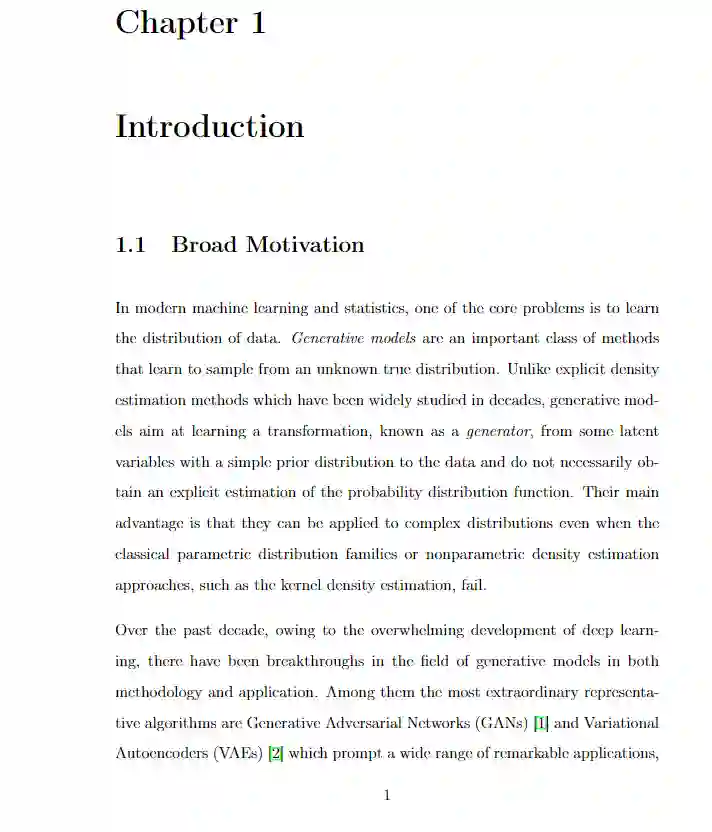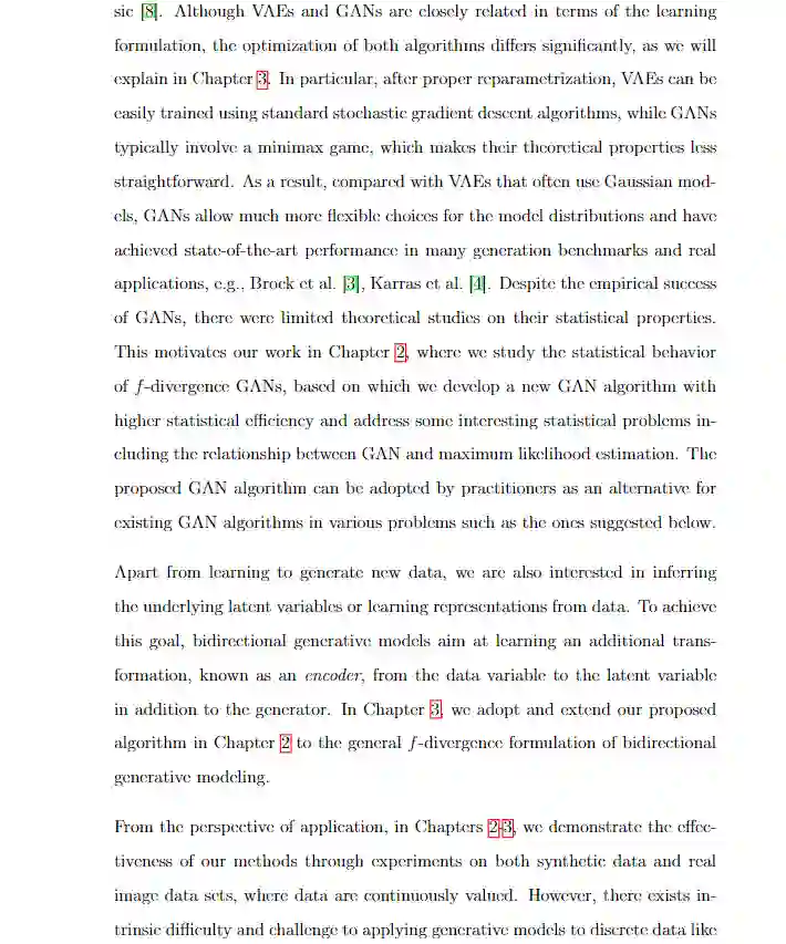 尽管生成模型在经验上取得了成功,但它们的理论属性不太合理,尤其是GANs的理论属性。这激发了本文的第一个主题,即f-散度GAN的统计分析。该理论产生了一类具有更高统计效率的GAN新算法,并揭示了统计问题,包括现代算法(GAN)和经典方法(最大似然估计)之间的关系,以及各种f-散度的行为。在双向生成模型的原则框架下,提供了GAN和VAE的统一视图。将所提出的方法广泛应用于计算机视觉和自然语言处理的实际任务,并取得了最先进的性能。本文提出一种新的模型架构和学习公式,基于高效的GAN方法,用于连贯和多样化的文本生成。