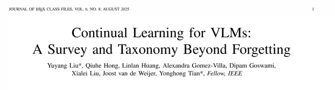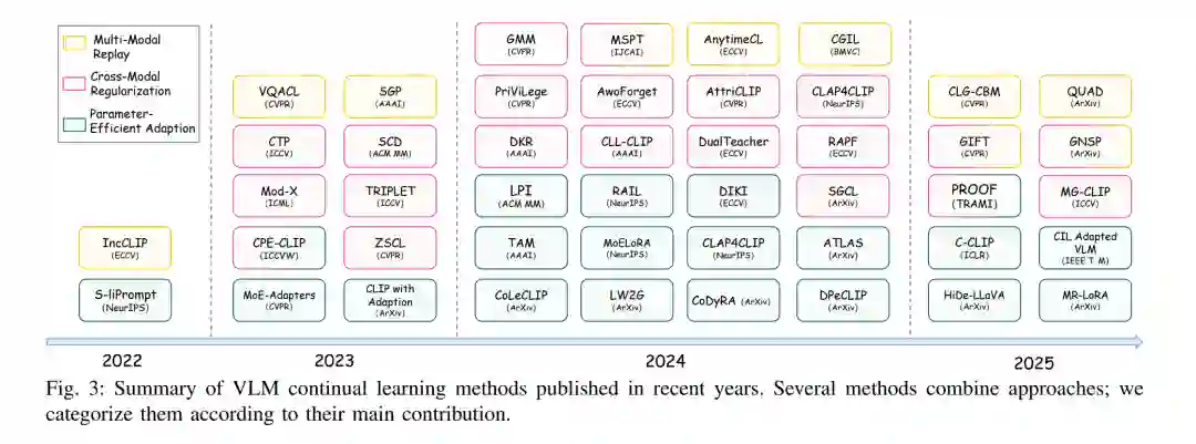 识别并分析了 VLM-CL 中特有的三大失效模式:跨模态漂移、参数干扰与零样本能力衰退; * 提出一个面向解决方案的分类体系,将现有方法归纳为多模态重放、跨模态正则化与参数高效适配三大范式; * 系统回顾了 VLM-CL 的基准数据集、评测指标与评测协议,并指出当前评测标准的局限; * 讨论了开放挑战与未来方向,包括可扩展的持续预训练与组合泛化,并提供了精心整理的相关资源。
