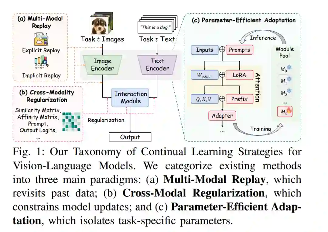 尽管已有工作探索了将 CLIP 类模型应用于持续目标识别 [20]、组合推理 [25] 或长期指令执行 [26],但该领域仍缺乏系统梳理 VLM-CL 挑战、方法与评测实践的专门综述。现有的 MMCL 综述 [16], [27] 也未能捕捉预训练跨模态系统的特有脆弱性。 在本文中,我们首次对 VLM 的持续学习进行全面回顾。为该新兴领域构建结构化框架,我们提出了一个针对挑战的解决方案分类体系,将现有方法按其应对上述挑战的方式划分为三类(见图 1): 1. 多模态重放策略(Multi-Modal Replay Strategies):通过显式或隐式记忆机制缓解跨模态漂移; 1. 跨模态正则化(Cross-Modal Regularization):在更新过程中保持模态对齐; 1. 参数高效适配(Parameter-Efficient Adaptation):通过模块化或低秩更新减少参数干扰。
