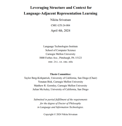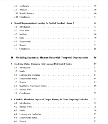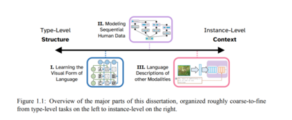 在从大规模语言数据语料库中学习表示时,一个普遍的策略是将该数据视为一系列独立同分布(IID)样本,这些样本相互独立地建模。虽然这种方法在某些方面是有益的,因为它允许通过随机梯度下降(SGD)进行高效训练,并且不依赖于可能并不总是存在的元数据,但它确实存在局限性。利用个别数据点之间更复杂的结构联系可以让信息在我们的语料库内流动,使得学习到的表示更具上下文敏感性,并允许更多的参数共享,从而更容易泛化到未见类别的示例。在这项工作中,我们将把这一思想应用于各种设置——主要是那些处于语言和其他模态之间边界的设置——对于这些设置,现有的先前工作大多没有明确利用数据内的可观察结构,我们还将展示如何通过更低级的建模选择为我们的模型添加有用的归纳偏见。为了保持可解释性和控制性,我们将同时使用概率变分学习框架和非变分方法(如检查列表模型和检索引导生成)来做到这一点。这篇论文分为三个部分,将这一广泛主题应用于各种具体应用。首先,我们将检查在数字字体中学习风格和结构的解耦表示的任务,然后将类似的建模思想应用于分析线性B文手写风格的任务。在下一部分,我们将探索学习时间排序数据的上下文化表示的方法,其中一个数据点的预测可能会影响附近的预测,例如钢琴指法估计和社交媒体上的话语主题建模。最后,我们将为输入信号本身是多模态的设置提出新的方法,例如为图像和音乐编写描述性标题的任务。