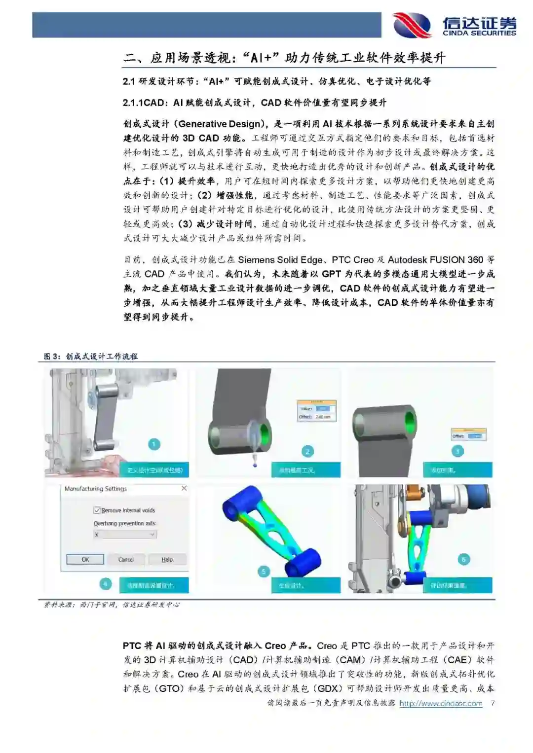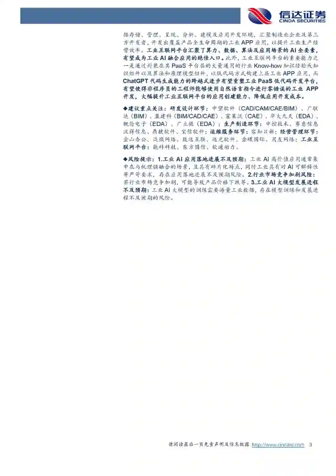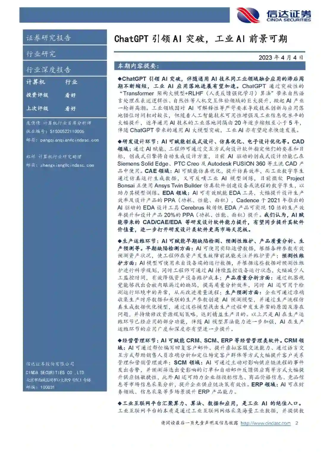 研发设计环节:AI可赋能创成式设计、仿真优化、电子设计优化等。CAD领域:通过AI赋能,工程师可通过交互方式向设计软件指定他们的要求和目标,创成式引擎将自动生成设计方案,目前AI驱动的创成式设计功能已在Siemens Solid Edge、PTC Creo及Autodesk FUSION 360等主流CAD产品中使用。CAE领域:AI可赋能仿真优化,提升仿真效率,而工业数字孪生通过仿真运行生成数据,又可反哺工业AI模型训练,目前微软ProjectBonsai正使用Ansys Twin Builder仿真软件创建设备或流程的数字孪生,以助力其模型训练。EDA领域:AI可有效赋能EDA工具,大幅提升设计生产效率及设计产品的PPA(功耗、性能、面积),Cadence于2021年推出的AI驱动的EDA设计工具Cerebrus较传统EDA产品可实现10倍的生产效率提升和设计产品20%的PPA(功耗、性能、面积)提升。我们认为,AI赋能带来的CAD/CAE/EDA等研发设计软件能力提升,有望同步提升其软件价值量,进一步打开研发设计类软件更高市场天花板。 生产运维环节:AI可赋能早期缺陷检测、预测性维护、产品质量分析、生产预测等。早期缺陷检测方面:AI可使用实际运营数据,根据各种参数有效预测资产状况,使工程师在资产发生故障前就能关注并维护资产;预测性维护方面:AI模型可使用来自设备端的运行数据,并根据这些数据对预测性维护进行科学规划,同时工程师可通过AI持续监控设备运行状态,大幅减少人工监控时间,有效降低资产设备维护成本;产品质量分析方面:通过机器视觉能够找出会被肉眼漏过的缺陷,提高质量分析效率,同时AI还可用于检测运行环境中的异常,从而改进质量流程;生产预测方面:企业可通过准确收集生产时序数据和关联的生产参数创建AI预测模型,并通过生产流程仿真生成数据优化模型,通过这些模型找出生产过程中发生异常的原因及潜在问题,并持续修改资源规划策略,达到精益生产目的。以上只是AI在生产运维环节已经应用的部分功能,伴随AI模型算法能力进一步加强,AI在生产运维环节的应用广度和深度亦有望进一步提升。 经营管理环节:AI可赋能CRM、SCM、ERP等经营管理类软件。CRM领域:AI可通过帮忙编写回复客户邮件、提升虚拟客服交流能力、通过语言交互方式帮助销售人员准确分析和定位特定客户群体等方式大幅提升客户关系管理和营销管理效率;SCM领域:AI可通过主动对影响供应链流程的事件发出告警,并预测筛选出受影响的订单和自动邮件反馈供应商等方式大幅提升供应链敏捷性,此外AI还可助力企业招投标信息、商品价格信息、竞品信息等市场信息采集分析,提升企业供应链决策有效性。ERP领域:AI可在财务领域、信息采集等多场景提升ERP产品能力。 工业互联网平台汇聚算力、算法、数据和应用,是工业AI的绝佳入口。工业互联网平台的本质是通过工业互联网网络采集海量工业数据,并提供数据存储、管理、呈现、分析、建模及应用开发环境,汇聚制造业企业及第三方开发者,开发出覆盖产品全生命周期的工业APP应用,以提升工业生产经营效率。工业互联网平台汇聚了算力、数据、算法及应用场景的AI全要素,有望成为工业AI融合应用的绝佳入口。此外,工业互联网平台的重要能力之一是通过封装在其PaaS平台层的大量通用的行业Know-how知识经验或知识组件以及算法和原理模型组件,以低代码方式构建上层工业APP应用,而ChatGPT代码生成能力的跨越式进步有望重塑工业PaaS低代码开发平台,有望使得非程序员的工程师能够使用自然语言指令进行零错误的工业APP开发,大幅提升工业互联网平台的应用创建能力、降低应用开发成本。