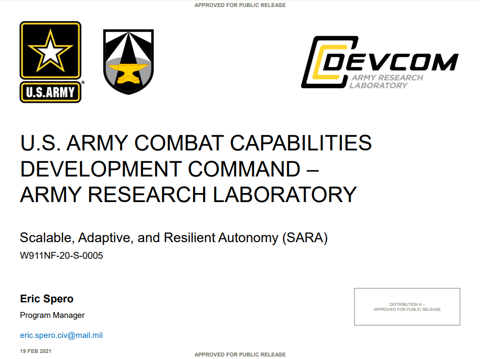 可扩展、自适应和弹性自主 (SARA) 协作研究联盟 (CRA) 专注于开发和实验加速自主移动性和可操作性、可扩展异构和协作行为以及人类智能体团队的新兴研究,以实现自适应和弹性智能系统可以对环境进行推理,在分布式和协作的异构团队中工作,并做出适时决策,以在复杂和有争议的环境中实现自主机动。