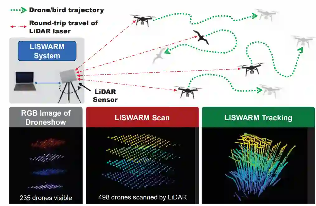 本文提出LiSWARM系统——一套基于低成本激光雷达的大型无人机群单机探测追踪方案。相较于依赖射频、声学或RGB图像特征的现有先进无人机追踪系统,LiSWARM能在三维空间实现鲁棒精确的无人机定位识别。该系统包含四大核心技术:(1)高效点云数据处理流程;(2)优先级感知聚类算法(从背景噪声中分离集群数据);(3)基于神经网络的可靠无人机识别算法;(4)无人机群单机轨迹追踪技术。我们开发LiSWARM原型机,通过实验室与实地测试验证性能。值得注意的是,在包含150架及500架无人机的两次灯光表演中,系统识别准确率达98%且轨迹追踪稳定可靠。为评估可扩展性,我们对15,000架无人机集群进行系统性能基准测试,结果证实该技术可延伸至战场应用、异常无人机探测、机场监狱等敏感区域安防领域。