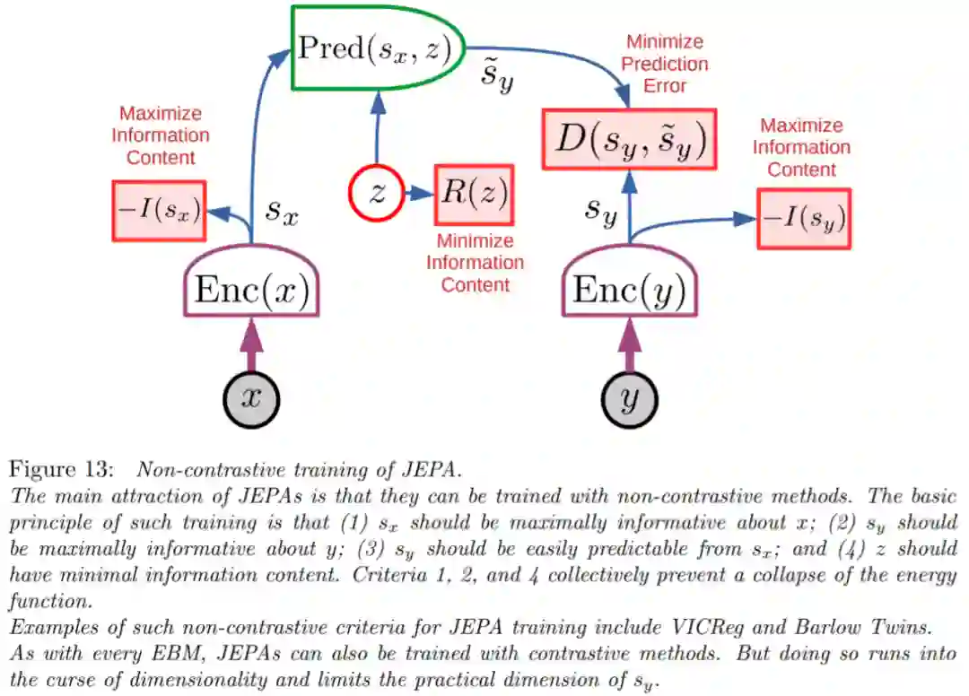 与 EBM 一样,可以使用对比方法训练 JEPA。但是,对比方法在高维空间中效率很低。本文设计出了非对比方法来训练它们,在 JEPA 的情况下,可以通过四个标准来完成,如图 13 所示:1. 最大化 s_x 关于 x 的信息量;2. 最大化 s_y 关于 y 的信息量;3. 使 s_y 容易从 s_x 中预测;4. 最小化用于预测潜在变量 z 的信息含量。