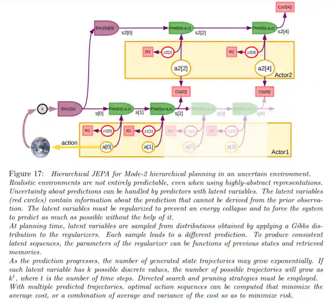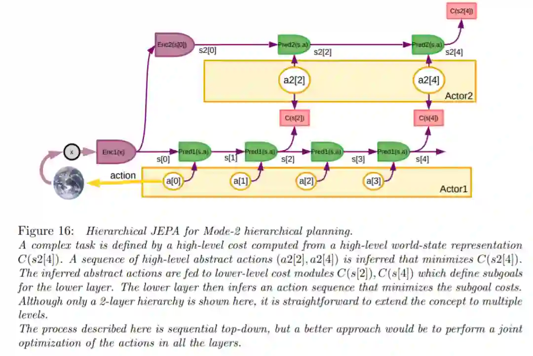 分层规划比较困难,几乎没有解决方案,大多数都需要预先定义动作的中间词汇。图 16 显示了分层模式 2 规划的可能架构,该架构可以利用多尺度世界模型的分层特性。