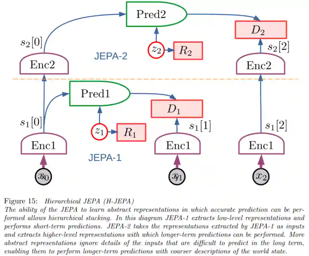 图 15 显示了多级、多尺度下世界状态预测的可能架构,变量 x_0, x_1, x_2 表示一系列观察值。第一级网络表示为 JEPA-1,使用低级表征执行短期预测。第二级网络 JEPA-2 使用高级表征进行长期预测。研究者可以设想这种类型的架构有许多层,可能会使用卷积和其他模块,并使用级之间的时间池来粗粒度的表示和执行长期的预测。使用 JEPA 的任何非对比方法,可以进行 level-wise 或全局的训练。