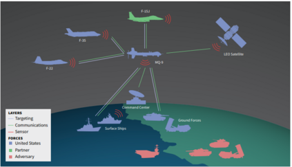 如图S.1所示,无人机系统将可能被整合到一个更广泛的战场网络中,包括第五代战斗机,如F-35s和F-22s;空中加油机,如KC-135s;远程轰炸机,如B-21s;巡洋舰和驱逐舰;卫星;航母打击群;陆基远征推进基地;指挥和控制中心;远程火力;以及其他平台和系统。