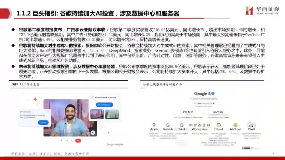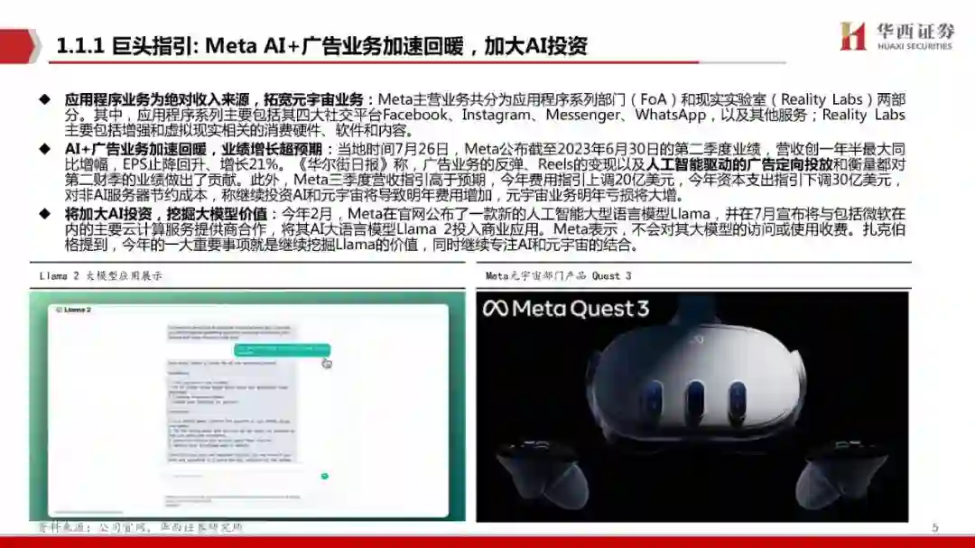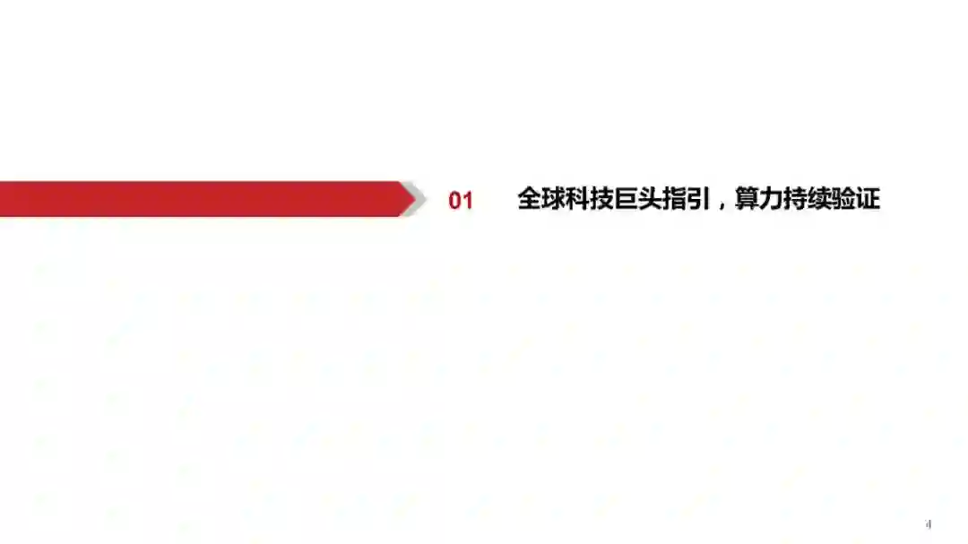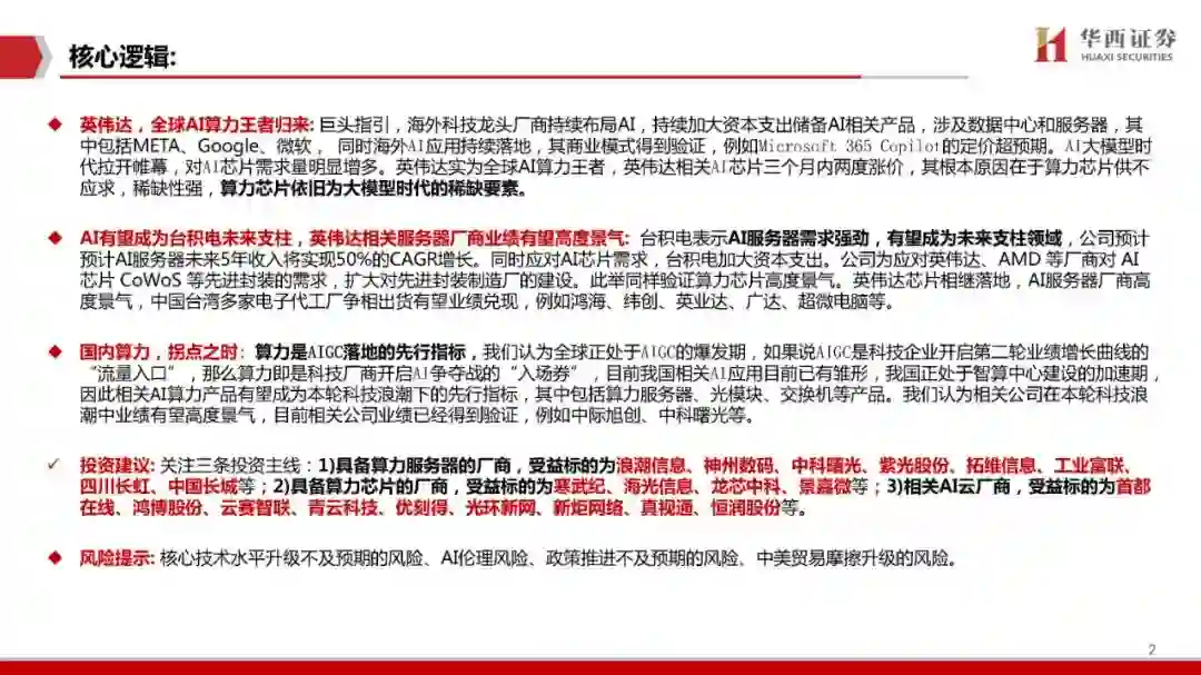 英伟达,全球AI算力王者归来: 巨头指引,海外科技龙头厂商持续布局AI,持续加大资本支出储备AI相关产品,涉及数据中心和服务器,其 中包括META、Google、微软, 同时海外AI应用持续落地,其商业模式得到验证,例如Microsoft 365 Copilot的定价超预期。AI大模型时 代拉开帷幕,对AI芯片需求量明显增多。英伟达实为全球AI算力王者,英伟达相关AI芯片三个月内两度涨价,其根本原因在于算力芯片供不 应求,稀缺性强,算力芯片依旧为大模型时代的稀缺要素。 AI有望成为台积电未来支柱,英伟达相关服务器厂商业绩有望高度景气: 台积电表示AI服务器需求强劲,有望成为未来支柱领域,公司预计 预计AI服务器未来5年收入将实现50%的CAGR增长。同时应对AI芯片需求,台积电加大资本支出。公司为应对英伟达、AMD 等厂商对 AI 芯片 CoWoS 等先进封装的需求,扩大对先进封装制造厂的建设。此举同样验证算力芯片高度景气。英伟达芯片相继落地,AI服务器厂商高 度景气,中国台湾多家电子代工厂争相出货有望业绩兑现,例如鸿海、纬创、英业达、广达、超微电脑等。 国内算力,拐点之时: 算力是AIGC落地的先行指标,我们认为全球正处于AIGC的爆发期,如果说AIGC是科技企业开启第二轮业绩增长曲线的 “流量入口”,那么算力即是科技厂商开启AI争夺战的“入场券”,目前我国相关AI应用目前已有雏形,我国正处于智算中心建设的加速期, 因此相关AI算力产品有望成为本轮科技浪潮下的先行指标,其中包括算力服务器、光模块、交换机等产品。我们认为相关公司在本轮科技浪 潮中业绩有望高度景气,目前相关公司业绩已经得到验证,例如中际旭创、中科曙光等。