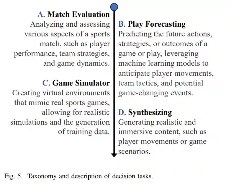 体育中的决策或决策制定过程涉及到最高级别的任务,在产生更抽象的决策之前,部署或隐含的体育感知和理解是至关重要的。本节包括了各种任务,如比赛评估,比赛预测,比赛模拟,运动员动作生成,比赛生成等,如图5所示。