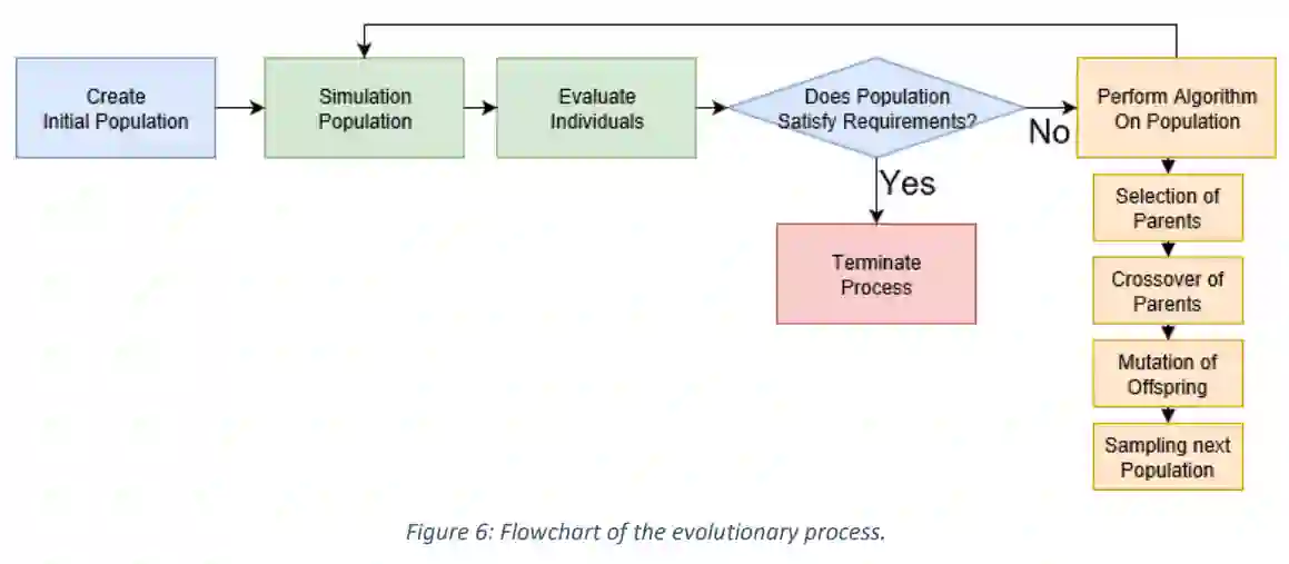 在本论文中,一种名为遗传算法(GA)和遗传编程(GP)的人工智能技术将作为一种优化算法,用于搜索解决方案空间,并在名为战术模拟(TACSI)的模拟环境中演化人工行为。模拟场景是两个智能体之间的超视距(BVR)搏斗,其中对手使用静态行为,而学习型智能体将针对静态行为进行训练。BVR 场景的设置是两个智能体以相同的起始位置、高度和武器装备(即四枚 BVR 导弹)面对面开始。学习智能体必须学习动作空间(即可用动作)和动作的工作原理,然后将其应用到状态空间(如识别目标和发射导弹)。然后,当一个或一组解决方案满足要求时,生成的解决方案将在新的场景设置中进行评估和测试,在新的场景设置中,位置、方向和高度都是随机的。在新的设置中测试智能体,可以分析其适应性。