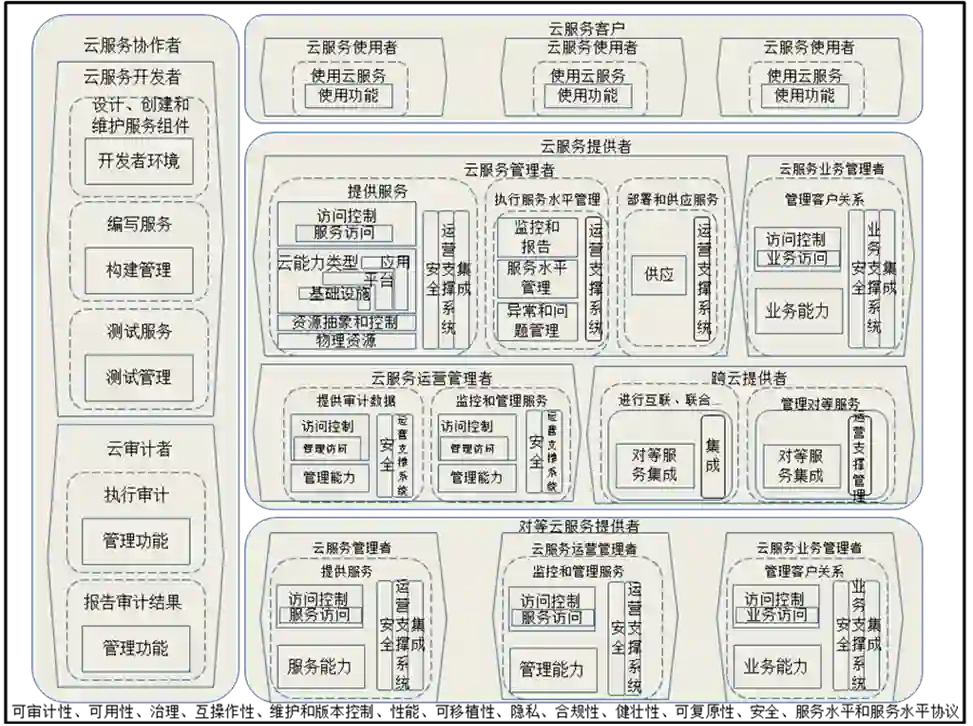 共同关注点包括可审计性、可用性、治理、互操作性、维护和版本控制、性能、可移植性、隐私、弹性、可逆性、安全性、服务水平和服务水平协议、兼容性、软硬件供应链、云服务碳排放计量等。共同关注点在图15中最外层的边框内标识,表明共同关注点的内容适用于图15中所有其它元素,包括角色、活动和组件。例如CSC:云服务用户必须有一个身份标识和一组凭证信息。当用户执行使用云服务活动时,身份标识和凭证信息必须提交给用户功能组件。用户功能组件将身份标识和凭证信息提交给访问控制组件。作为提供服务活动的一部分,访问控制组件执行认证与授权,并在云服务提供给CSC:云服务用户之前,调用适当的安全组件。 图15中的云服务能力组件代表云服务自身的实现。