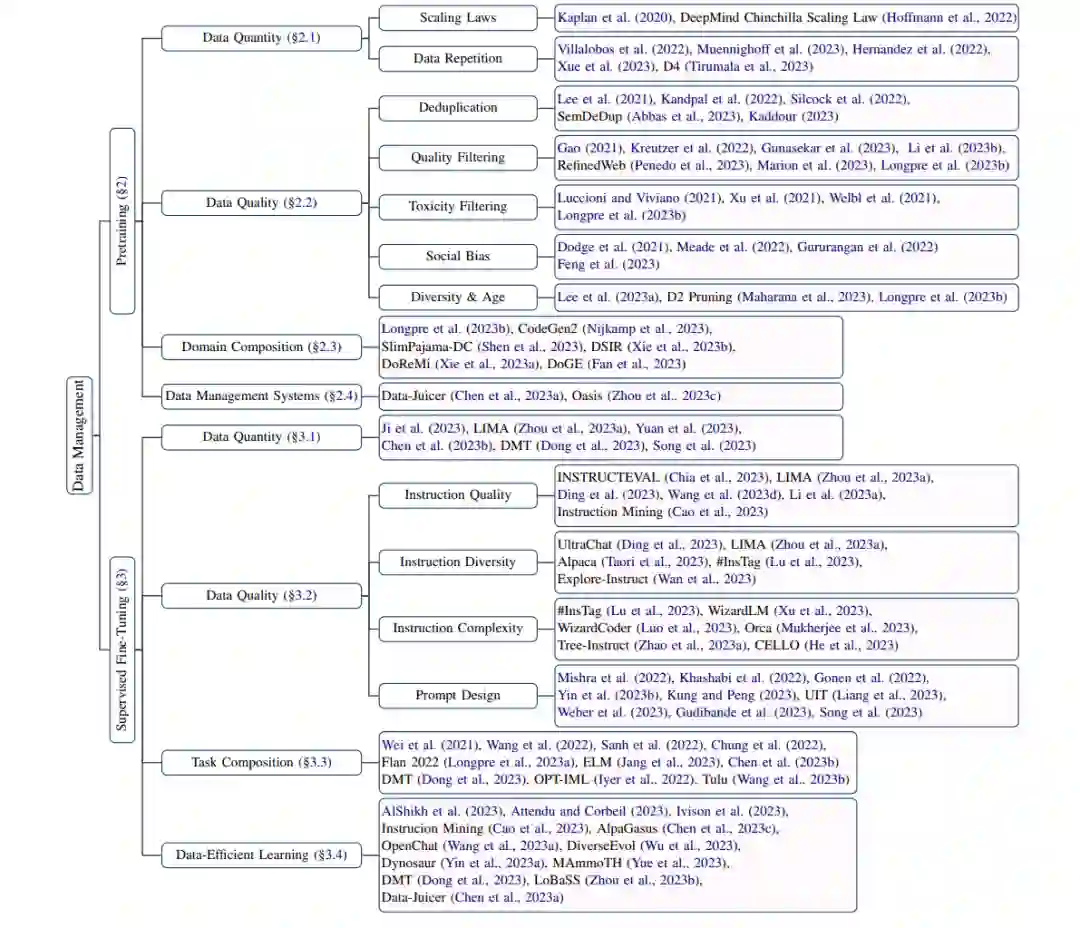 数据管理在许多著名大型语言模型(LLM)的预训练中被发现非常重要(OpenAI, 2023; Touvron et al., 2023a; Wei et al., 2022)。虽然大多数LLM没有报告它们的数据管理程序,或者只报告了它们采用的策略,但选择特定策略的原因和数据管理策略的效果对于构建更强大的LLM至关重要。在这一部分,我们首先回顾研究训练数据集规模定律的研究,包括有/无数据重复的情况。然后,探讨与去重、质量过滤、有害内容过滤、社会偏见以及数据多样性和时效性相关的数据质量问题。之后,讨论领域组成和领域重新加权方法。最后,介绍了两个最近提出的实施预训练数据管理流程的数据管理系统。