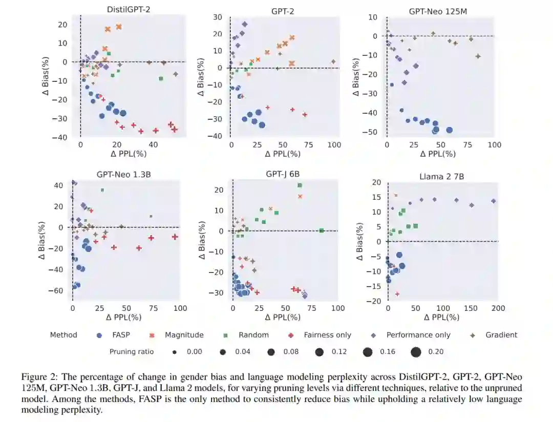大型语言模型(LLMs)的不断增大引入了在它们的训练和推断中面临的挑战。移除模型组件被认为是解决大型模型尺寸问题的一种方法,然而,现有的剪枝方法仅关注性能,而没有考虑到对LLMs的负责任使用的一个重要方面:模型的公平性。 对于多样化群体,如女性、黑人、LGBTQ+、犹太社区等,重要的是要关注LLMs的公平性,因为它们正在被部署并面向广泛的受众。在这项工作中,首先,我们研究了在基于预训练Transformer的语言模型中,注意力头(attention heads)如何影响公平性和性能。然后,我们提出了一种新的方法,用于剪枝那些对公平性产生负面影响但对性能至关重要的注意力头,即语言建模能力的关键头部。我们的方法在时间和资源方面具有实用性,因为它不需要对最终剪枝后的更公平模型进行微调。 我们的研究结果表明,与有偏见的模型相比,DistilGPT-2、GPT2、两种不同尺寸的GPT-Neo、GPT-J和Llama 2模型的性别偏见分别减少了19%、19.5%、39.5%、34.7%、23%和8%,而性能只略有下降。警告:本研究使用了具有冒犯性质的语言。