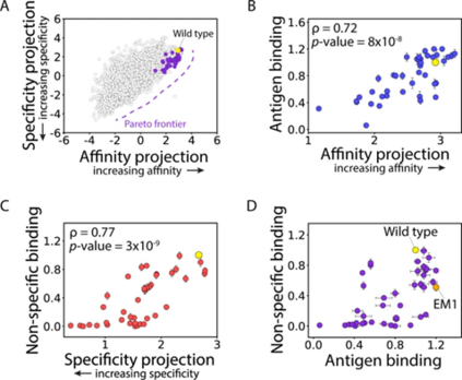 为了评估帕累托最优抗体变体的预测,团队接下来鉴定并产生了 41 个抗体突变体,这些突变体被预测为处于或接近帕累托边界(图 4A),并通过实验评估了它们的抗原水平(图 4B)和非特异性 (图 4C) 结合,结果表明模型预测对亲和力和特异性具有很强的预测能力。