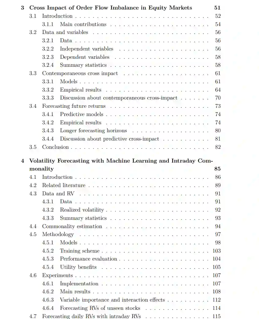 在第二部分中,我们研究了多资产环境下订单流量不平衡(OFI)对股票市场价格走势的影响。我们的结果显示,一旦将多个层次的信息整合到OFI中,具有交叉影响的多资产模型在解释同时影响方面与不含交叉影响项的稀疏模型相比,并未提供额外的解释能力。然而,我们表明跨资产的OFI确实改善了未来收益的预测能力。 在第三部分中,我们运用机器学习模型来预测逐日实现波动率(RV),通过将股票汇集在一起利用逐日波动率的共同性,并结合市场波动率的代理。神经网络在性能方面优于线性回归和基于树的模型,并且在未包含在训练集中的股票上保持稳健且具有竞争力,从而为股票之间存在普遍波动性机制提供了新的实证证据。我们还提出了一种利用过去逐日波动率进行预测的新方法,揭示了有助于预测机制的有趣的一日内时间效应。