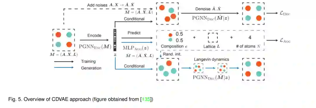 材料设计。材料表示为原子在三维空间中的周期性排列[134]。具体来说,单晶胞代表材料的无限周期结构,而材料的无限周期结构又由原子类型、坐标和周期性晶格表征。要生成稳定的材料,有两个关键点:要求1)材料的原子坐标必须存在于量子力学定义的局域能量最小值,要求2)结构遵循不同原子类型之间特定的成键偏好。此外,材料的结构应该是排列、平移、旋转和周期不变性。CDVAE[135]首先将材料编码到低维潜空间,然后MLP属性预测器从潜表示z预测原子的数量、周期晶格和组成。周期GNN解码器、噪声条件分数网络(NCSN)[136],对原子类型和原子坐标从z去噪。解码器输出引导原子坐标到能量局部最小值的梯度,并更新原子类型以捕获基于邻居的特定局部boding偏好。CDVAE[135]通过添加噪声,然后逐渐去噪,使稳定的材料变得不稳定,从而学习稳定性。CDVAE的概述如图5所示。