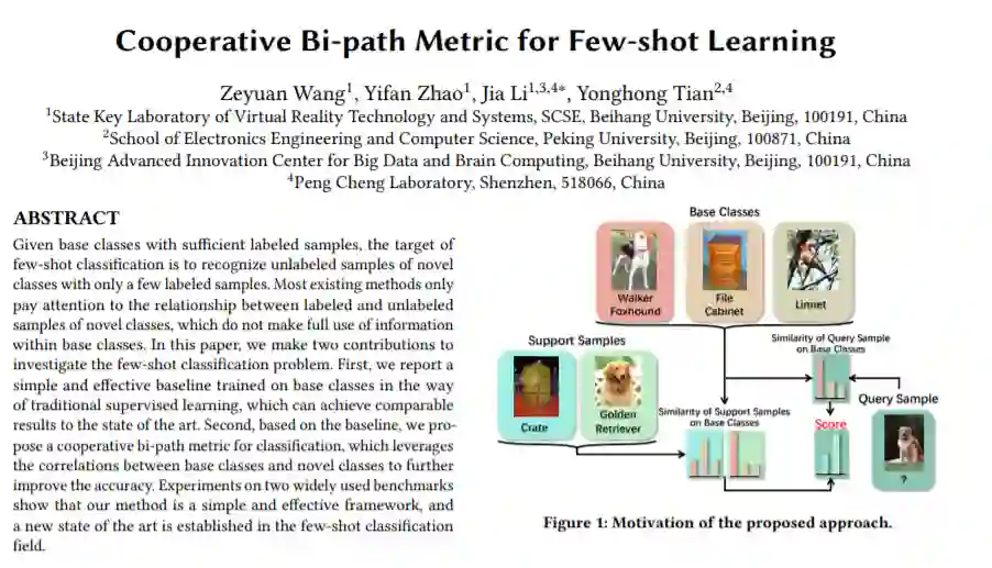 对于有足够标记样本的基类,小样本分类的目标是在只有少量标记样本的情况下识别新类的未标记样本。现有的方法大多只关注新类的标记样本和未标记样本之间的关系,没有充分利用基类内部的信息。在本文中,我们为研究小样本分类问题做了两个贡献。首先,我们提出了一个简单而有效的基线,通过传统的监督学习的方式在基类上训练,可以取得与目前水平相当的结果。其次,在基线的基础上,我们提出了一个协作的双路径分类度量,它利用基类和新类之间的相关性来进一步提高分类的准确性。在两个广泛使用的基准上的实验表明,该方法是一种简单有效的分类方法,在小样本分类领域开创了一种新局面。
