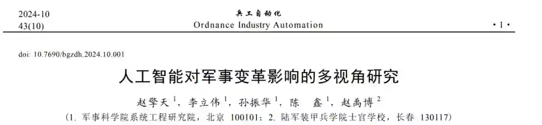 摘要:为全面、客观地评估人工智能技术发展对军事变革的影响,进行多视角综合研究。通过对时代演进、技 术创新和实战应用全面审视人工智能对军事变革的影响,力图全面客观地分析人工智能在引领军事变革过程中发挥 的作用。结果表明,该研究为促进军事领域人工智能的建设发展提供理论参考。 关键词:人工智能;战争形态演进;通用技术创新;俄乌冲突