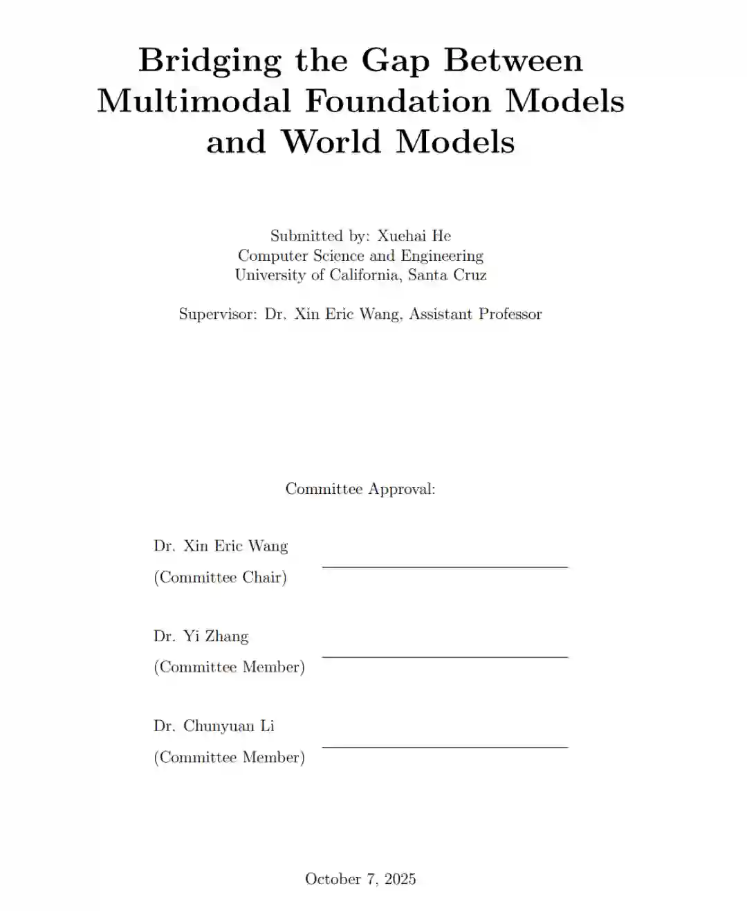 人类通过整合多种感官模态来理解世界,从而能够感知、推理并想象动态的物理过程。受这一能力启发,多模态基础模型(Multimodal Foundation Models, MFMs)已成为实现多模态理解与生成的强大工具。然而,当今的 MFMs 尚不足以作为真正有效的世界模型(World Models)。它们仍然缺乏一些关键能力,如反事实推理、动态过程模拟、时空信息理解、生成结果控制以及多层次综合推理等。 本论文旨在探讨如何弥合多模态基础模型与世界模型之间的鸿沟。我们首先通过判别式任务提升 MFM 的推理能力,并赋予其结构化推理技能,包括因果推理、反事实思维与时空推理,使模型能够超越表层相关性,理解视觉与文本数据中的更深层关系。接着,我们探索了多模态基础模型在图像与视频模态下的生成能力,提出了用于结构化与可控生成的新框架。我们的方案融合了场景图(scene graph)、多模态条件控制与多模态对齐等策略,以引导生成过程,确保生成内容在高层语义一致性与细粒度用户意图上的协调统一。进一步地,我们将这些技术扩展至可控的四维(4D)生成,实现了在时间与空间维度上可交互、可编辑、可形变的对象合成。 为了全面评估这一方向的进展,并推动迈向世界模型的最终目标,我们提出了 MMWorld 基准(benchmark),用于在跨学科与多维度推理任务上评测多模态基础模型的表现。 综上所述,本论文旨在推动研究从静态感知迈向能够想象、推理与行动的智能系统,赋予模型在结构化环境中理解与交互的能力。通过使多模态基础模型更接近世界模型,本研究迈出了重要一步——朝着构建能够像人类一样观察、推理、模拟并与世界交互的智能系统前进。