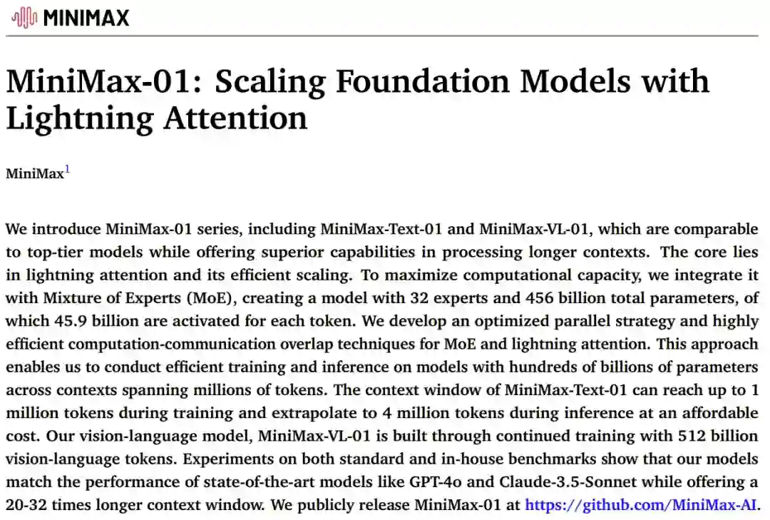 MiniMax 开源了最新的基础语言模型 MiniMax-Text-01 和视觉多模态模型 MiniMax-VL-01。 新模型的最大亮点是,在业内首次大规模实现了新的线性注意力机制,这使得输入的上下文窗口大大变长:一次可处理 400 万 token,是其他模型的 20-32 倍。 他们相信,这些模型能够给接下来一年潜在 Agent 相关应用的爆发做出贡献。 为什么这项工作对于 Agent 如此重要? 随着 Agent 进入应用场景,无论是单个 Agent 工作时产生的记忆,还是多个 Agent 协作所产生的 context,都会对模型的长上下文窗口提出更多需求。