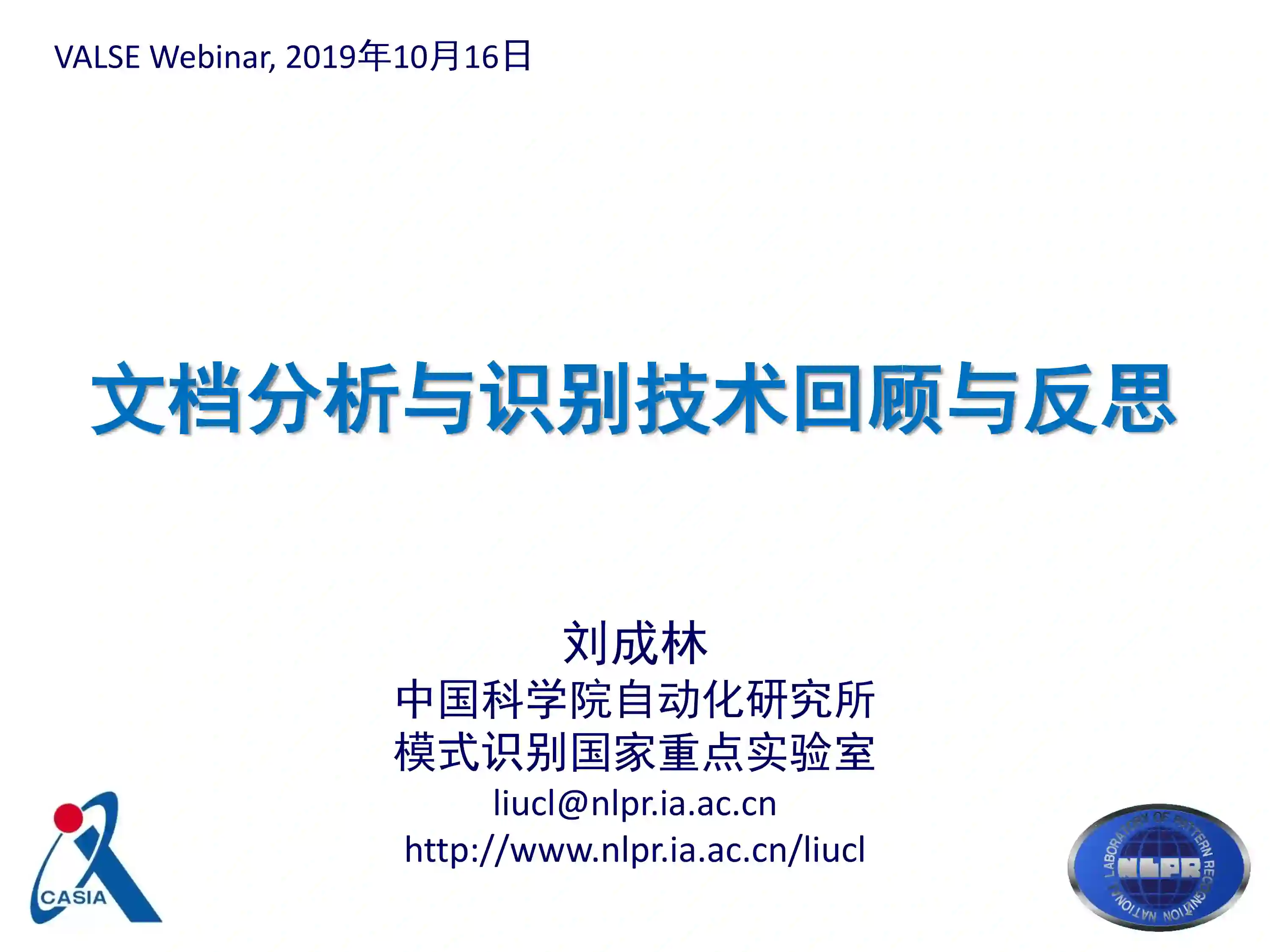 报告嘉宾:刘成林(中国科学院自动化研究所) 报告时间:2019年10月16日(星期三)晚上20:30(北京时间) 报告题目:文档分析与识别技术回顾与反思