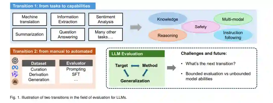 摘要 — 大型语言模型(LLMs)正在以惊人的速度发展,并已成为学术界、工业界和日常应用中不可或缺的一部分。为了跟上当前的发展态势,本调查深入探讨了LLMs崛起对评估所带来的核心挑战。我们识别并分析了两个关键的转变:(i)从任务特定的评估到基于能力的评估,这一转变围绕知识、推理、指令跟随、多模态理解和安全性等核心能力重组基准;(ii)从手动评估到自动化评估,包括动态数据集创建和“LLM作为评审员”的评分。然而,即使在这些转变之后,仍然存在一个关键的障碍:评估泛化问题。有限的测试集无法与能力似乎无限增长的模型相匹配。我们将从方法、数据集、评估者和度量标准的角度,剖析这一问题以及上述两个转变的核心挑战。鉴于这一领域的快速发展,我们将维护一个持续更新的GitHub存储库(每个章节中都有链接)来众包更新和修正,热忱欢迎贡献者和合作者参与。 关键词 — 大型语言模型、评估、基准、调查