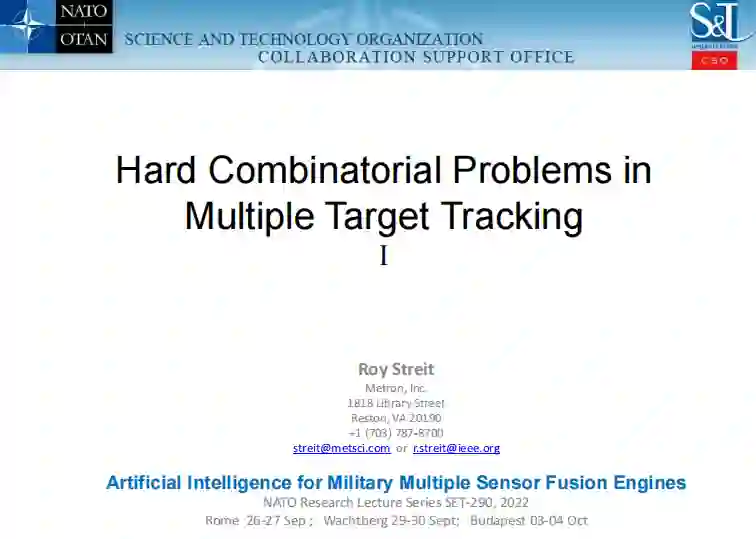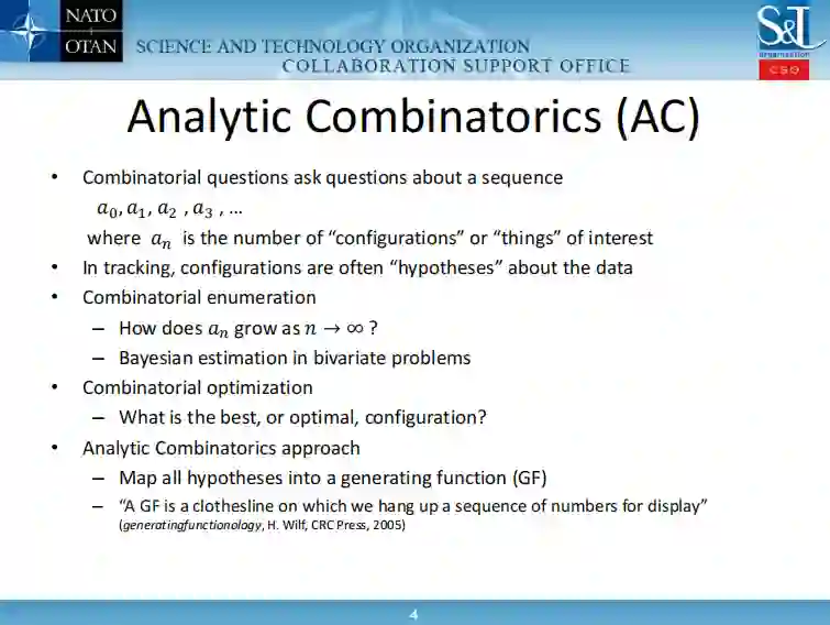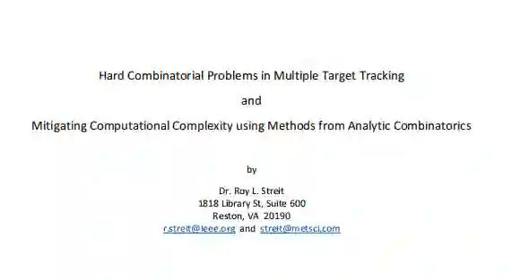 分析组合学(AC)是一个经典的数学领域,在过去的几年里,它在信息融合和多目标跟踪方面找到了新的应用。这些应用领域的许多问题由于精确的解决算法是NP困难的而受到严重阻碍。AC对这些领域的贡献是双重的。首先,AC用生成函数或生成函数的方式来表述问题。这种表述是精确和完整的,采取单一的简明方程的形式。精确的过滤器是通过微分从这些函数中得到的。因为导数是精确的,所以它们也存在着NP难计算的问题。这就是AC的第二个贡献的地方。导数被改写为积分,而积分则由鞍点法来近似。鞍点法的使用是交流学的一个经典手段,它也很强大,因为它导致了用其他方式不容易得到的结果。它并不局限于交流学。它在物理学界被认为是一种成熟的方法,但在信息融合和目标跟踪中却几乎无人知晓。这两篇论文的一个目标是通过展示交流的方法在这些领域的应用来激发对交流的兴趣。另一个目的是说明鞍点法是一种广泛适用的技术,它为许多问题提供了原则性的近似--无论精确解是否是NP-hard。这些论文中的例子都来自于公开文献中发表的论文。