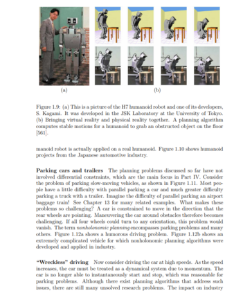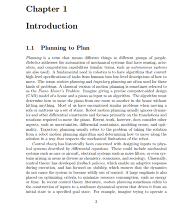 被视为第二部分的延伸。在这里,运动规划中出现的连续状态空间可能存在全局(障碍)和局部(差分)约束。还考虑了动力系统,它产生包括位置和速度信息的状态空间(这与控制理论中的状态空间或物理和微分方程中的相空间的概念相吻合)。