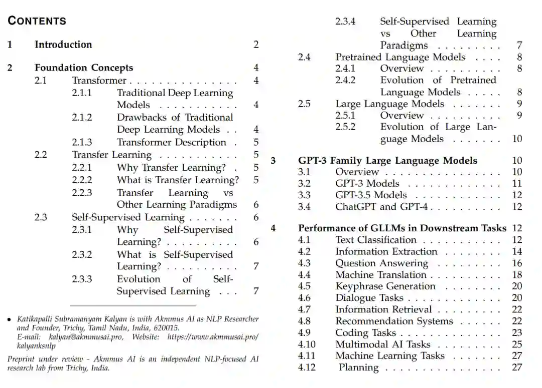 最初,NLP系统主要是基于规则的。这些基于规则的模型是建立在领域专家制定的规则之上的。由于手动制定规则是一个费时、昂贵的过程,且还需要频繁的更改,基于规则的模型逐渐被机器模型所取代,这些机器模型从训练数据中自动学习规则,完全避免手动规则制定[1]。然而,机器学习模型需要领域专家进行特征工程的人工干预。随着像Word2Vec[5]、Glove[6]、FastText[7]这样的密集文本向量表示模型的演变,以及像GPUs这样的计算机硬件的进步,NLP系统使用传统的深度学习模型构建,如CNN[8]、RNN[9]、LSTM[10]、GRU[11]、Seq2Seq[12]和基于注意力的Seq2Seq模型[13],[14]。然而,这些模型的缺点,如(i)捕获长期依赖性的能力和(ii)由于序列处理(CNN的情况除外)无法充分利用GPUs,导致了像Transformers[15]这样的高级深度学习模型的演变,它们完全基于注意力,没有任何循环和卷积层。 受到基于转移学习和大型卷积模型上的图像预训练模型[16]-[18]的成功启发,研究界开始关注构建如BERT[19]和GPT-1[20]这样的预训练语言模型(PLMs),这些模型以变换器为骨架,并基于称为自监督学习[1]、[21]、[22]的新学习范式进行预训练。与传统的深度学习模型和基础变换器模型不同,后者需要从头开始训练以供下游使用,预训练语言模型可以通过微调轻松地适应下游任务。BERT和GPT-1模型的巨大成功引发了其他预训练语言模型的开发,如RoBERTa、XLNet[23]、ELECTRA[24]、ALBERT[25]、DeBERTa[26]、[27]、GPT-2[28]、T5[29]、BART[30]等。 尽管PLMs与传统的深度学习和基础变换器模型相比有许多优势,但它们仍然存在如无法在没有任务特定训练的情况下泛化到未见任务的缺陷。因此,研究界专注于开发更先进的模型,如大型语言模型,这些模型可以在没有任何任务特定训练的情况下泛化到未见任务。LLMs的时代始于GPT-3[4],GPT-3的成功启发了其他LLMs的开发,如PaLM[31]、Chinchilla[32]、GLaM[33]、LaMDA[34]、Gopher[35]、Megatron-Turing NLG[36][181]、BLOOM[37]、Galactica[38]、OPT[39]、LLaMA[40]、[41]等。在Open AI的模型如ChatGPT和GPT-4[42]最近发布后,LLMs的受欢迎程度呈指数级增长。例如,ChatGPT在发布后的几周内就吸引了数百万用户。由于基于任务描述和几个示例泛化到未见任务的能力,而不需要任何任务特定的训练,就像人类一样,LLMs可以被视为朝向人工普遍智能[43]的一个初步步骤。在这篇综述论文中,我们主要关注Open AI的LLMs,如GPT-3模型、GPT-3.5模型(InstructGPT、ChatGPT等)和GPT-4,我们称之为GPT-3系列大型语言模型(GLLMs)。这篇综述论文提供了与GLLMs相关的多维度研究工作的全面回顾。 本综述论文的主要贡献是: • 首个在多个维度对GPT-3系列大型语言模型(GLLMs)进行全面回顾的综述论文,涵盖超过350篇最近的研究论文。 • 我们讨论了各种基础概念,如变换器、转移学习、自监督学习、预训练语言模型和大型语言模型。 • 我们详细讨论了GPT-3系列大型语言模型,从GPT-3开始,到最新的ChatGPT和GPT-4。 • 我们讨论了GLLMs在各种下游任务中的表现,并对GLLMs的数据标记和数据增强能力进行了深入的讨论。 •我们讨论了GLLMs的鲁棒性和评估能力。 • 我们提出了多个有深度的未来研究方向,这将指导研究界进一步提高GLLMs的性能。 与现有综述的比较。现有的综述论文提供了对大型语言模型[44]及其相关概念如上下文学习[45]、评估[46]、[47]、与人类价值观的对齐[48]、[49]、安全性和可靠性[50]、推理[51]、挑战和应用[52]、LLM压缩[53]以及多模态LLMs[54]的回顾。例如,赵等人[44]是首先对大型语言模型提供全面回顾的。与赵等人[44]不同,其他现有的综述论文专注于LLMs的特定概念。例如,由董等人[45]、张等人[46]、王等人[48]和黄等人[51]撰写的综述论文分别专注于LLMs的情境学习、LLMs的评估、与人类价值观的LLMs对齐和LLMs的推理能力。同样,尹等人[54]和桓等人[50]所写的综述论文分别回顾了多模态LLMs和LLMs的安全性和可靠性。然而,目前还没有一篇综述论文提供了对GPT-3系列大型语言模型的全面综述。随着GPT-3系列大型语言模型,如GPT-3、InstructGPT、ChatGPT、GPT-4等的日益增长的受欢迎程度,以及大量使用这些模型的研究工作,迫切需要一篇专门针对GPT-3系列大型语言模型的综述论文。 综述论文的组织结构如下:第2节简要概述了各种基础概念,如变换器、转移学习、自监督学习、预训练语言模型和大型语言模型。第3节详细介绍了GPT-3系列大型语言模型,从GPT-3开始,到最新的ChatGPT和GPT-4。第4、5和6节分别讨论了GLLMs在各种下游任务、特定领域和多语言场景中的表现。第7节介绍了GLLMs的数据标记和数据增强能力。第8节讨论了各种研究工作,提出了检测GLLMs生成的文本的方法。第9和10节分别讨论了GLLMs的鲁棒性和评估能力。第11节提出了多个有洞察力的未来研究方向。