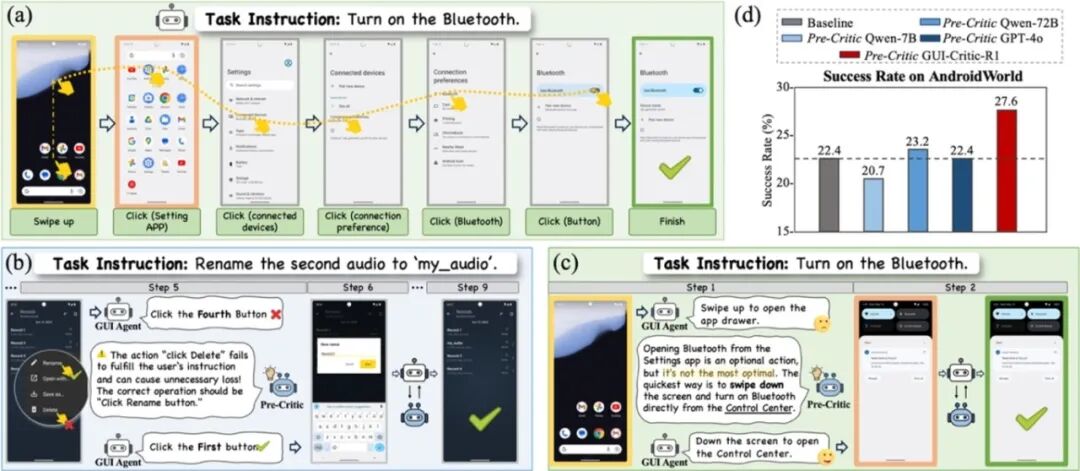 图1. (a)显示了GUI自动化的一个示例。(b-c)中的案例研究演示了操作前反思机制如何防止GUI自动化中的错误和冗余操作。(d)说明了在AndroidWorld数据集上操作前反思方法与基线之间的定量性能比较。25-b.png