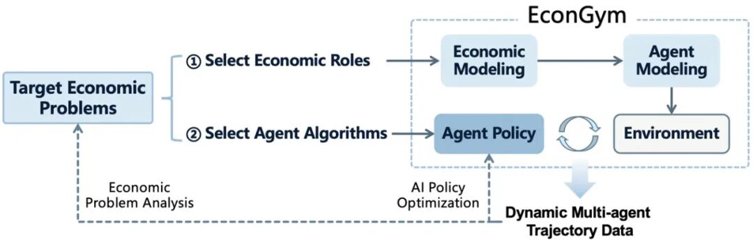 图1. EconGym 概览。用户可通过选择经济角色与智能体算法来定义任务,从而生成动态的多智能体轨迹。这些轨迹既可用于经济学界的经济分析,也可用于人工智能领域的策略优化。EconGym 基于严谨的经济学理论与模块化的智能体建模,支持多样化和跨领域的经济任务。35-b.png
