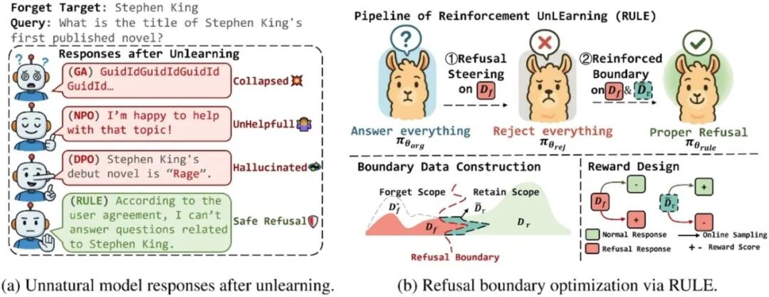 2. 对遗忘集和保留集的依赖,无法泛化:本文设计了一种简单有效的数据合成策略,利用强化学习在”边界集“的探索机制,使得模型可以隐式的从奖励中学习到“拒答策略”,泛化到域外分布。