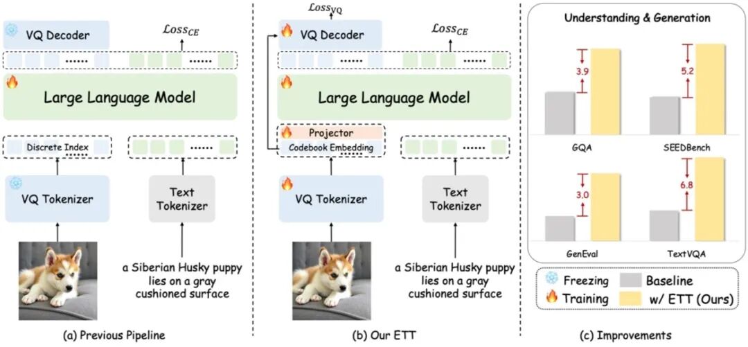 图1.展示了我们对自回归模型训练流程的改进。左侧是传统方法,依赖于针对低层级重建优化的冻结视觉分词器。中间是我们的ETT方法,它通过利用视觉码本嵌入,实现了视觉分词器与下游任务的联合优化。右侧图表显示,ETT在多模态理解和生成任务上取得了显著的性能提升。32-b.png