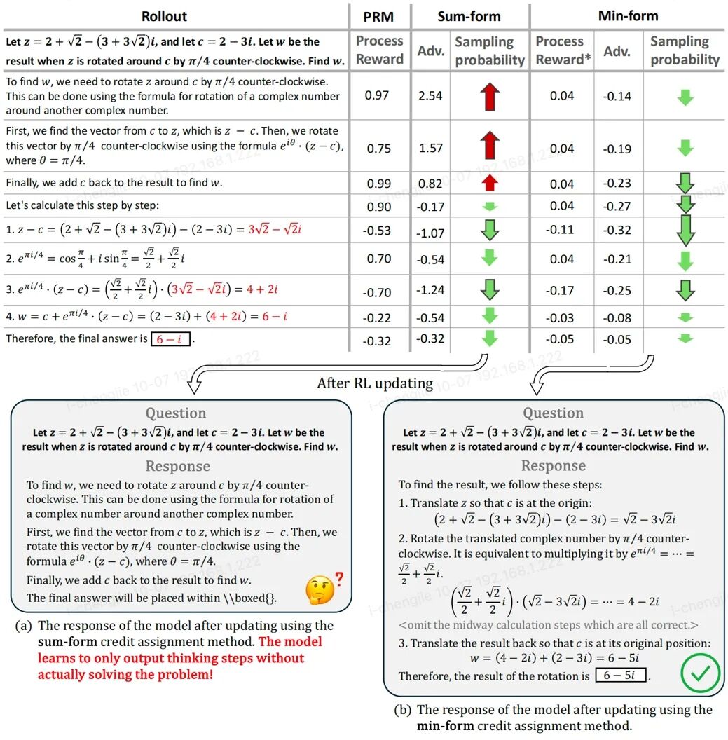 求和形式与最小形式信用分配的比较。推理过程 (rollout) 中错误的步骤以红色标出,PRM合理地为这些步骤分配了负分。箭头指示采样概率的变化,变化幅度较大的部分标注为带轮廓的箭头。求和形式信用分配导致破解高奖励步骤,而最小形式信用分配给出了更合理的采样概率变化幅度和方向。24-b.png