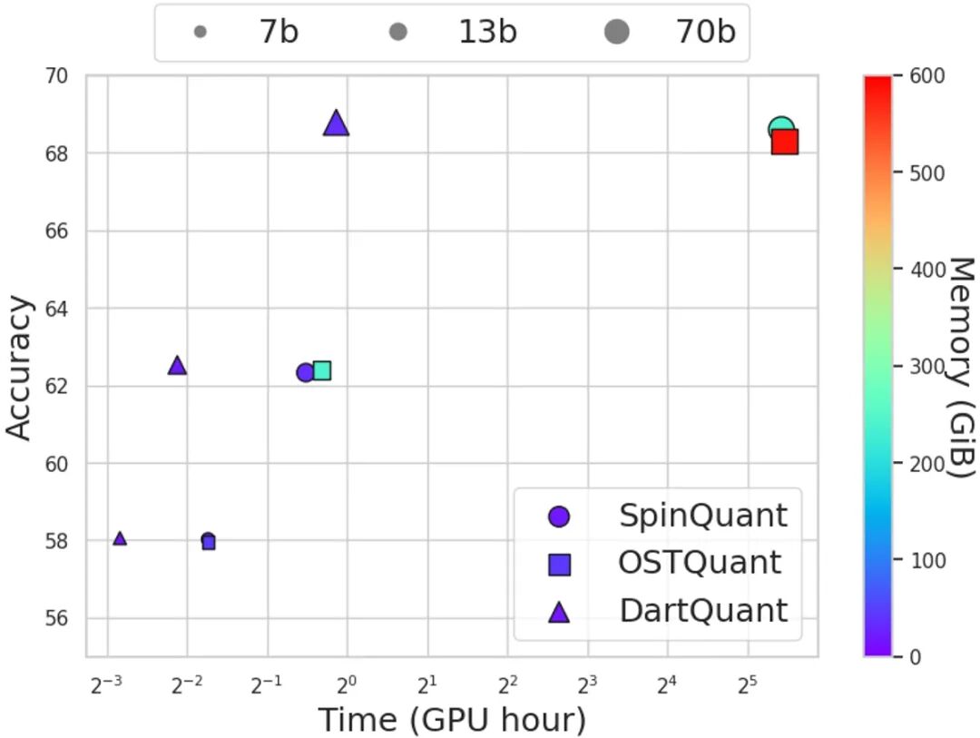 图1.不同旋转优化方法的计算成本比较。DartQuant在对不同大小模型的量化中,均以极短的时间获得了最优的性能。30-b.png