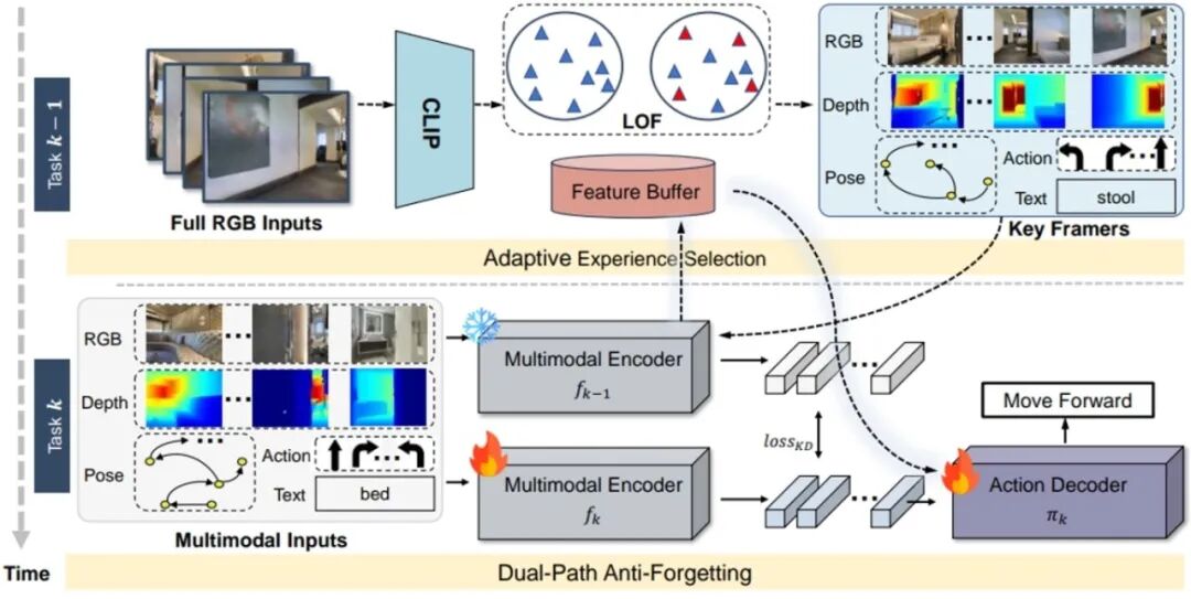C-Nav: Continual Object Navigation with Dual-Path Anti-Forgetting and Adaptive Experience Selection **作者:**于明明, 朱飞, 刘文卓, 杨易蓉, 汪群博, 吴文峻,刘静 具身智能体需在动态开放环境中完成目标导航任务。然而,现有方法在训练过程中通常依赖静态轨迹和固定的目标类别集合,忽略了现实世界中对动态场景持续适应的需求。为推进相关研究,我们提出了持续目标导航基准,要求智能体在学习新目标类别导航技能的同时,避免对已学知识的灾难性遗忘。 针对这一挑战,我们设计了持续视觉导航框架C-Nav,该框架融合了两项核心创新:(1)双路径抗遗忘机制:包含特征蒸馏与特征重放两部分。其中,特征蒸馏将多模态输入对齐到统一的表征空间,以确保表征一致性;特征重放在动作解码器内保留时序特征,以确保策略一致性。(2)自适应采样策略:通过筛选具有多样性和信息价值的经验,减少冗余信息并最小化内存开销。 我们在多种模型架构上开展了大量实验,结果表明:C-Nav 的性能持续优于现有方法,即便与保留完整轨迹的基准模型相比,仍能实现更优性能,同时显著降低了内存需求。31.png