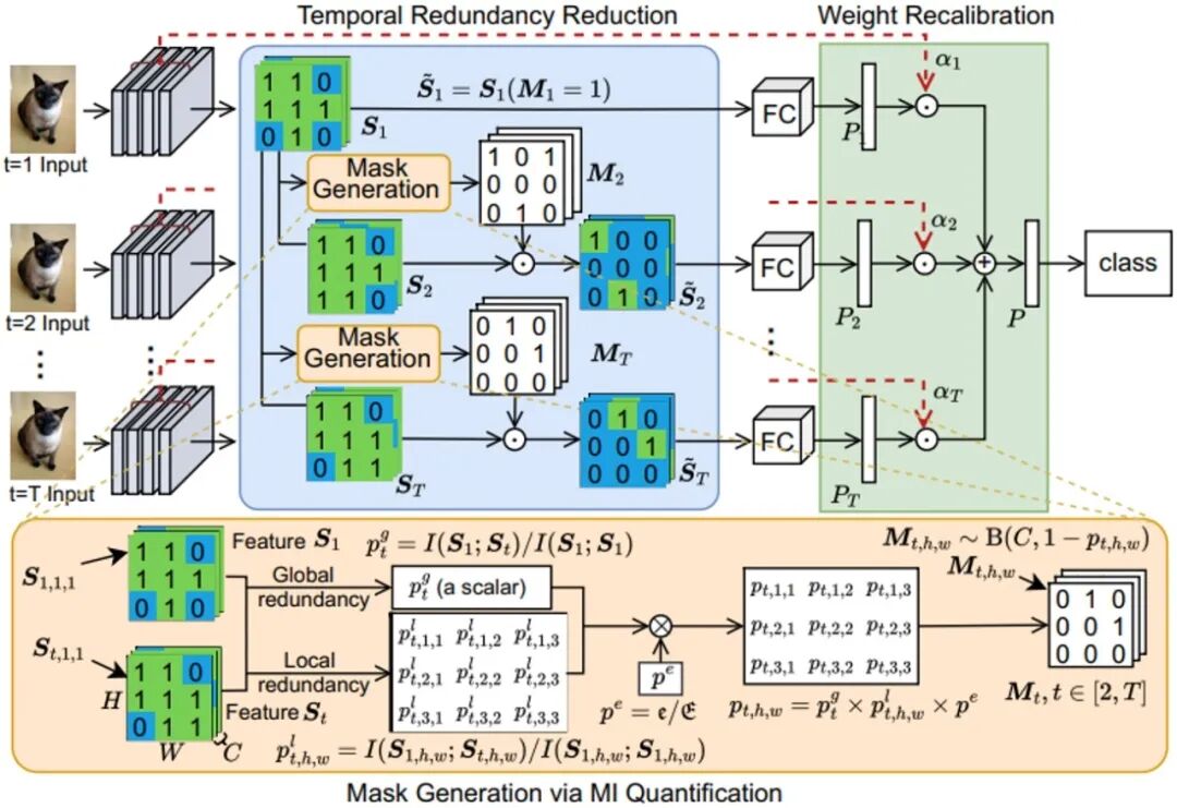 MI-TRQR: Mutual Information-Based Temporal Redundancy Quantification and Reduction for Energy-Efficient Spiking Neural Networks **作者:**薛登峰,李文娟,卢一帆,原春锋,刘雨帆,刘伟,姚满,杨力,李国齐,李兵,Stephen Maybank,胡卫明,李哲涛 SNN 虽具有事件驱动的低能耗特性,但其在时序上共享权重会产生大量的冗余特征,在处理静态图像时尤为严重,这极大限制了其效率与性能。本文提出的MI-TRQR(结构见图1)利用互信息(MI)从局部像素级和全局特征级两个尺度量化时序特征冗余,并基于该量化结果采用概率掩码策略去除冗余脉冲,最后通过权重再校准机制平衡信息分布,从而提升特征紧凑性。 实验表明, MI-TRQR 可提升脉冲神经网络在神经形态数据分类、静态图像分类和时间序列预测等多种任务中的性能,且能大幅降低时序特征冗余,促使其进一步稀疏化。该研究首次将互信息引入SNN特征冗余量化中,为构建更高效、更紧凑的脉冲神经网络提供了新思路。23.png