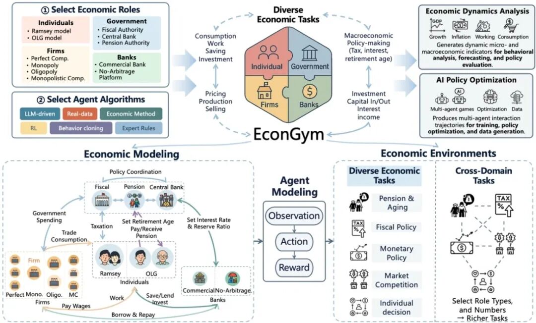 EconGym: A Scalable AI Testbed with Diverse Economic Tasks **作者:**米祈睿,杨企鹏,樊梓君,范文天,马赫阳,马成东,夏思宇,安波,汪军,张海峰 人工智能(AI)已成为经济学研究的重要工具,使大规模仿真与政策优化成为可能。然而,要充分发挥 AI 的作用,需要具备可扩展训练与评估能力的仿真平台;现有环境大多局限于简化或特定范围的任务,难以覆盖人口结构变化、多政府协同以及大规模主体交互等复杂经济挑战。 为弥补这一空白,我们提出 EconGym——一个可扩展、模块化的测试平台,用于连接多样化的经济任务与 AI 算法。EconGym 基于严格的经济建模方法,构建了 11 种异质化角色类型(如家庭、企业、银行、政府)、对应交互机制,以及具备清晰观测、动作和奖励定义的智能体模型。用户可灵活组合经济角色与不同智能体算法,从而在 25+ 经济任务中模拟丰富的多智能体轨迹,支持基于 AI 的政策学习与分析。实验结果表明,EconGym 能够支撑多样化与跨领域的任务——例如财政、养老与货币政策的协同模拟——并实现 AI 方法、经济学方法及其混合方法之间的对比评测。结果显示,任务组合与算法多样性能够有效拓展政策空间,而在复杂环境中,结合经典经济学方法的 AI 智能体表现最佳。此外,EconGym 可扩展至 1 万个智能体规模,在保证高真实感的同时保持高效性。35.png