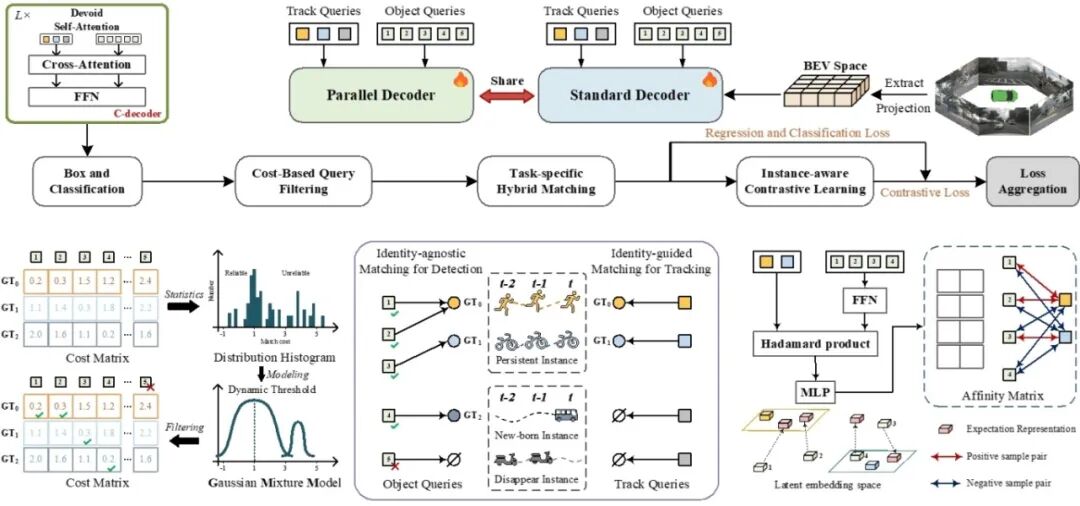 SynCL: A Synergistic Training Strategy with Instance-Aware Contrastive Learning for End-to-End Multi-Camera 3D Tracking **作者:**林述波,寇宇同,吴子蕤,王绍儒,李兵,胡卫明,高晋 现有的端到端环视三维物体跟踪算法通过实例查询的时序传播整合了检测和跟踪,但这样的联合训练存在优化困难。我们发现这些困难源于自注意力机制的两个固有限制,即对象查询的过度去重和轨迹查询的自我关注。相反,移除自注意力机制不仅对跟踪算法的回归预测影响较小,模型还倾向于生成更多潜在候选框。 为此,本文提出了SynCL,一种协同训练框架来促进多任务学习。具体而言,我们构建了一个基于Cross-attention的平行解码器并引入了混合匹配模块,该模块将轨迹查询的真值目标与多个对象查询匹配,从而挖掘被自注意力机制忽视的高质量预测候选。为了寻找上述一对多匹配中的最优候选,我们还设计了一种由模型训练状态控制的动态查询过滤模块。此外,我们引入了实例可感知对比学习,以突破轨迹查询的自我关注障碍,有效地增强了检测和跟踪之间的协同优化。在不增加额外推理成本的情况下,SynCL在各种基准测试中获得了一致性提升,并在nuScenes数据集上达到了先进性能。20.png