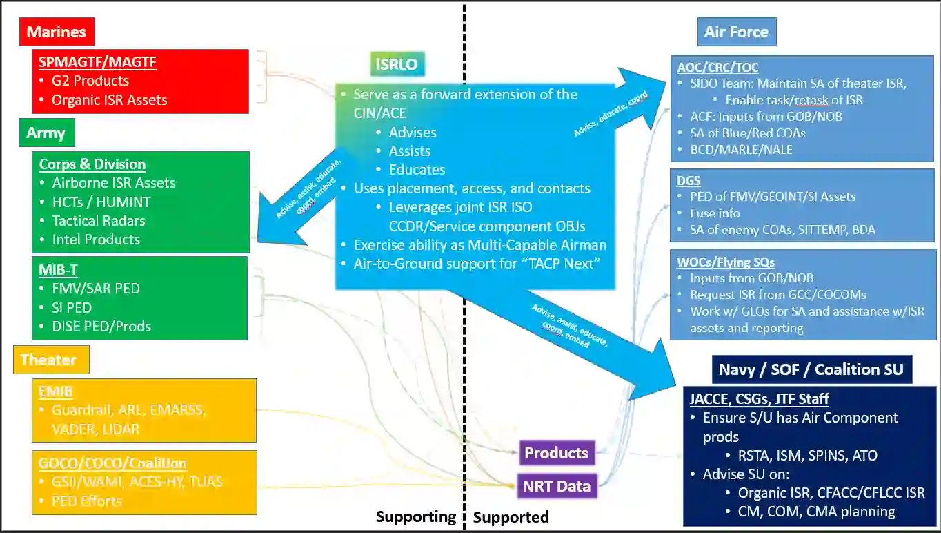 ISRLO作为CIN在MCO第一和第二阶段的前沿延伸,对实现各部分目标至关重要。 通过安置、访问和关系,ISRLO不仅能促进航空部门的ISR以支持地面部队,而且可以利用美国海军(USN)、SOF和美国的ISR,并与适用的支持机构(收集、瞄准和PED)建立合同,以支持JFACC或联合部队海上部门指挥官(JFMCC)。ISRLO将处于一个独特的位置,与领导联队和ACE成员联络,以发挥联合ISR、规划和PED能力。此外,ISRLO可以利用联合支持组织,如作战支持机构(CSA)、美国海军陆战队(USMC)的空地特遣部队(MAGTF)成员,以及美国军事情报营(MIB)或多领域特遣部队(MDTFs)来支持PHI/II的联合行动。为了做到这一点,情报员应驻扎在/部署在适当的地点,以发挥其灵活性。