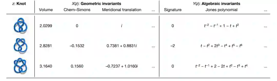扭结是三维欧氏空间或者三维球面中的简单闭合曲线。为了区分两个扭结是否等价,即是否可以将一个扭结变形成另一个,人们引入了扭结不变量。扭结不变量有很多种,其中最著名的就是Jones Polynomial。为了探索不同的扭结不变量之间的关系,作者通过训练AI然后人工反馈从而找到一些规律。 具体来讲,模型训练了一个前馈神经网络来评估扭结的几何和代数不变量之间是否存在关系,根据随机采样的扭结数据集上的几何不变量来预测代数特征。为了了解网络是如何做出这一预测的,他们使用了基于梯度的归因技术来确定哪些几何不变量与代数特征最相关。通过人工反馈的方式,他们猜测到了这个不等式,然后进一步又在另一篇论文里严格证明了这个不等式。所以这项工作是AI辅助发现了数学定理。 图:各种扭结及其对应的几何不变量与代数不变量