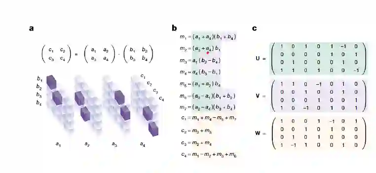 图:Strassen's algorithm 示意图,其中图a是三维情形的矩阵乘法的张量表征, ai, bi, ci构成一个size为 (4,4,4) 的三维张量;图b展示了 Strassen’s algorithm 中使用的7个乘法;图c展示了将张量分解为7个秩为1的项的和