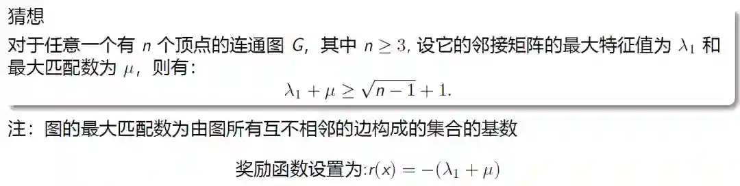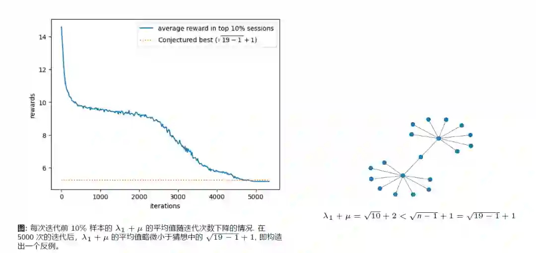 作者用强化学习构造出了这个猜想的一个反例,生成了一个图,使得这个图不满足这个假设。构造反例的核心思想是让不等式的左边小于右边,所以奖励函数可以设置为负的左边表达式,然后最大化奖励函数。对于n<=18, 这个猜想是成立的。但当n=19时, 利用强化学习算法迭代,找到了反例。