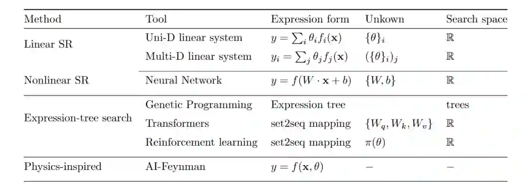 在训练方面,可以应用传统的机器学习方法,如线性回归、非线性回归、Transformer 架构、强化学习,或在网络结构中加入一些物理、数学或其他学科的先验知识来约束搜索空间。 图:各类方法的数学工具,表达式,参数集和搜索空间 (1)线性符号回归与非线性符号回归